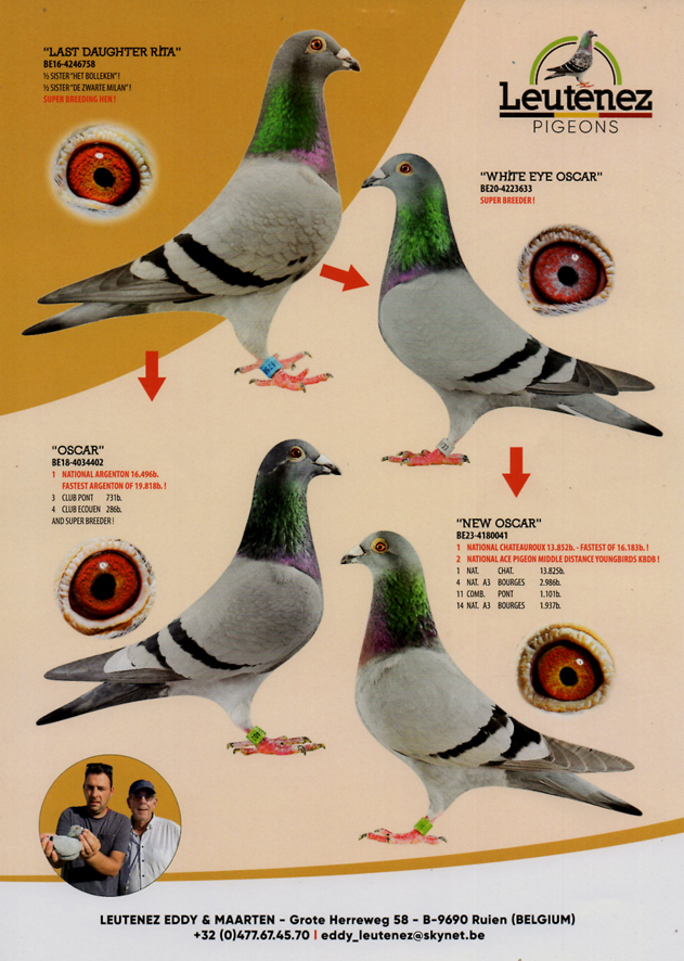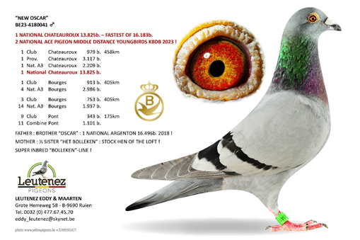 “奧斯卡號B18-4034402灰公”, 2018年比利時亞精頓19.818羽總冠軍。全弟”白眼奧斯卡號B20-4223633灰公”作出2023年查特盧斯II全國16.537羽總冠軍及比利時幼鴿組大中距離KBDB全國鴿王亞軍。( B23-4180041灰公”新奧斯卡” )。