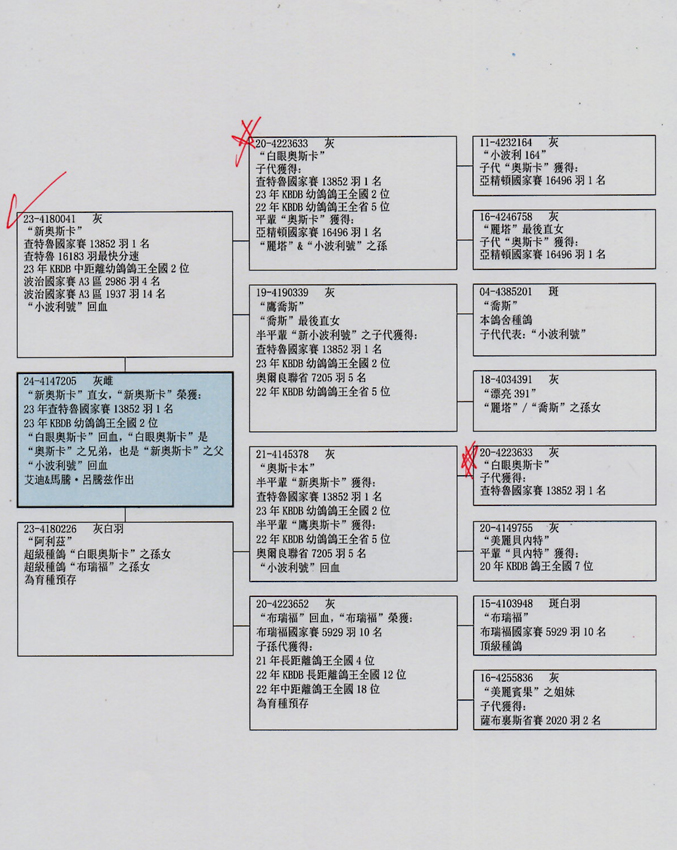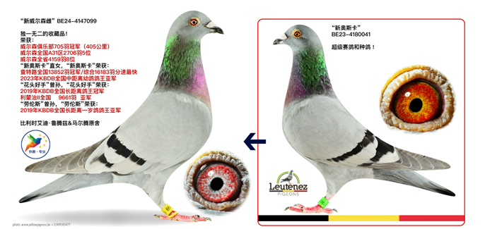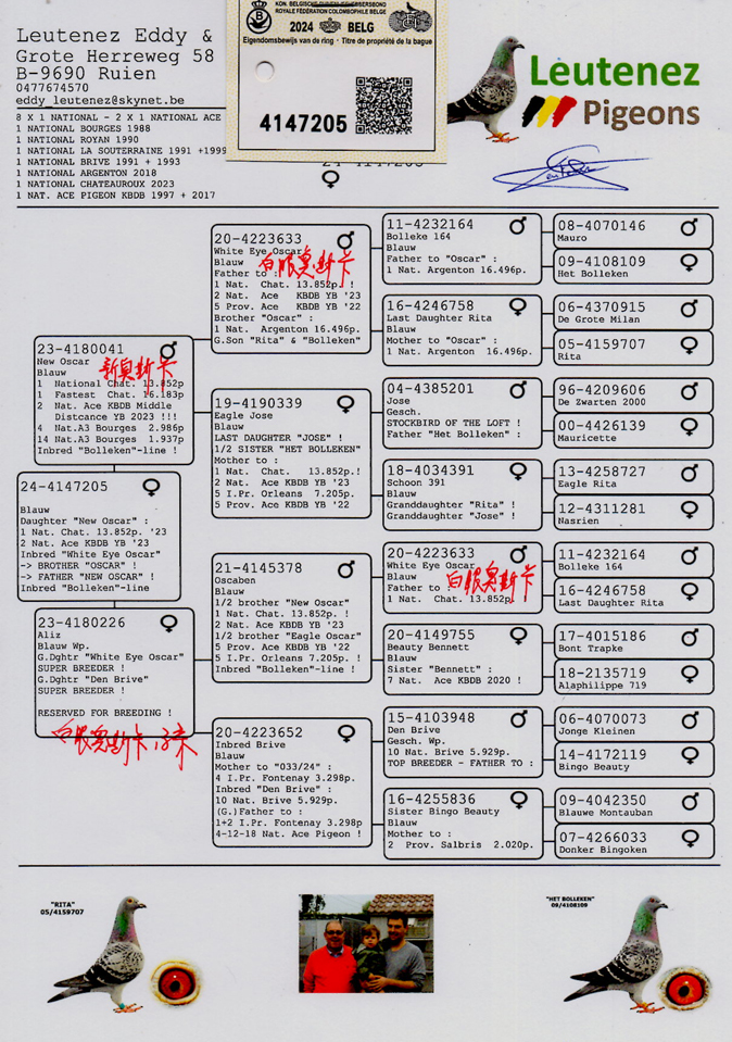 ”奧斯卡”的全弟”:”白眼奧斯卡 B20-4223633灰公” 作出”新奧斯卡B23-4180041灰公”獲得2023年查特盧斯II全國16.537羽總冠軍及比利時幼鴿組大中距離KBDB全國鴿王亞軍。