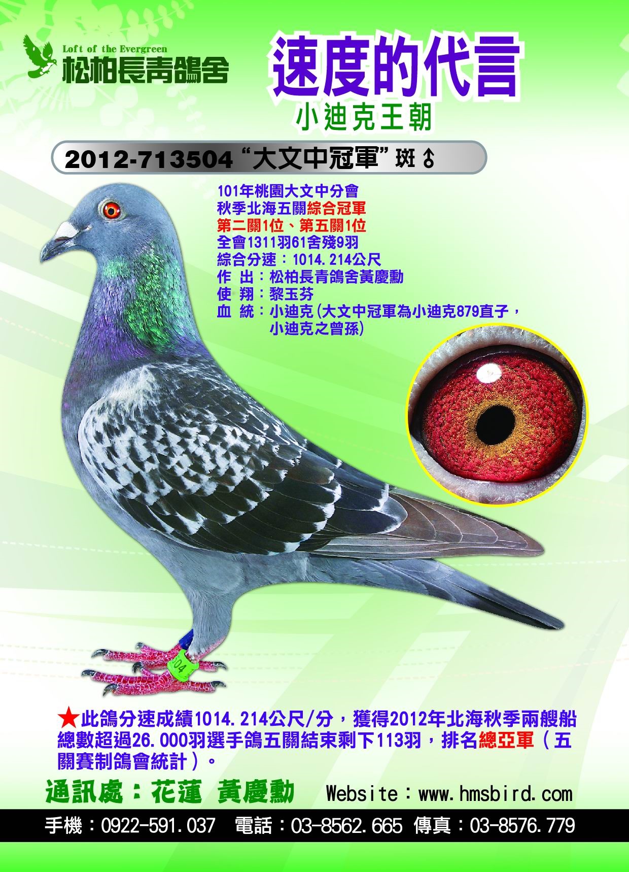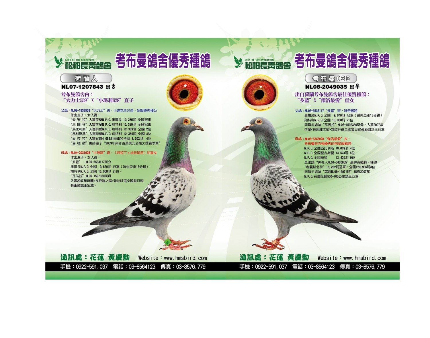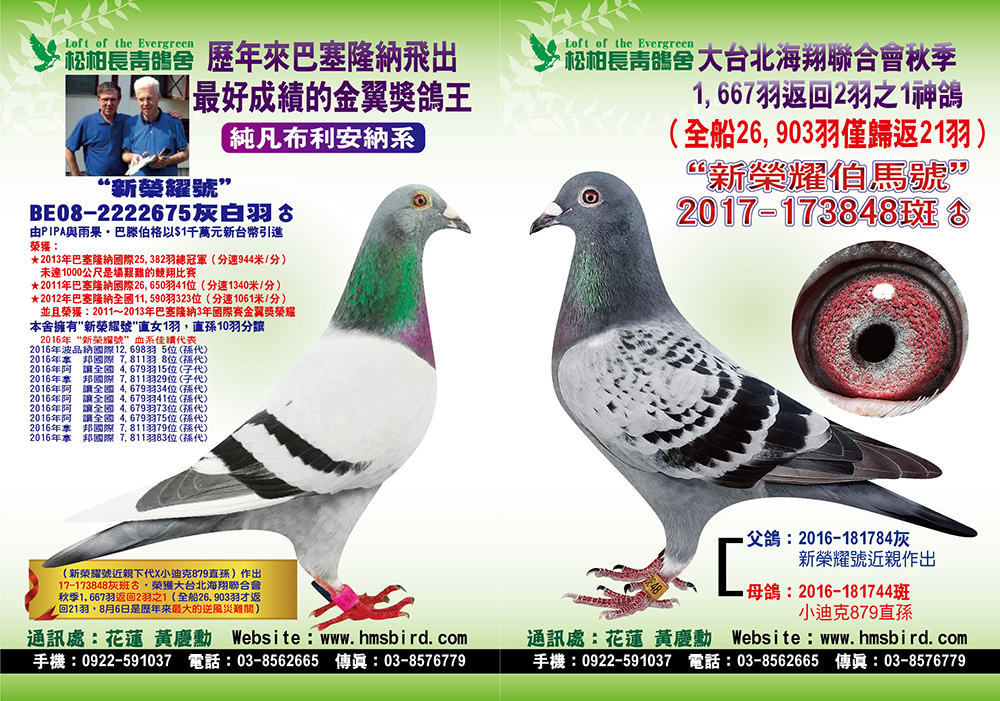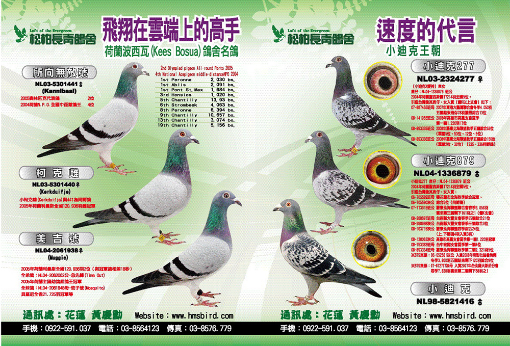(二)波治家族鴿系:波治國家賽是比利時所有國家賽中(屬中距離450~550公里)公認速度最快的競翔比賽,往往波治一戰,立即成名天下知。國內速度快的鴿系大多來自波治賽得獎的後代。松柏長青鴿舍自早期引進菲利普.吉爾特先生的”拿榜號”(波治全國66.533羽冠軍並超速17分)後,成績大放光芒。接著更引進荷蘭波西瓦鴿舍的利曼斯Le Mans全國120.936羽破世界記錄的冠、亞軍兄弟姊妹鴿家族(公認速度最快的飛哥系列),再熔合比利時歷年的全國冠軍鴿系,期待自己培育出來的鴿系速度能保持世界尖端位置。
