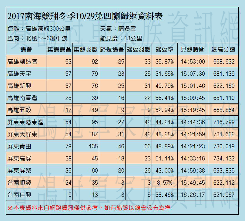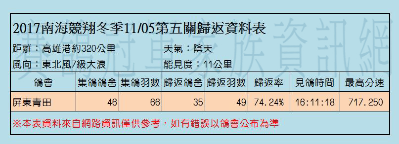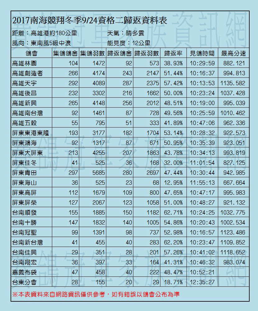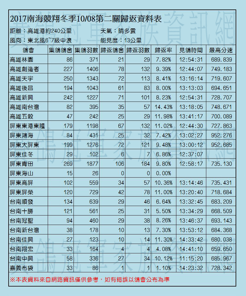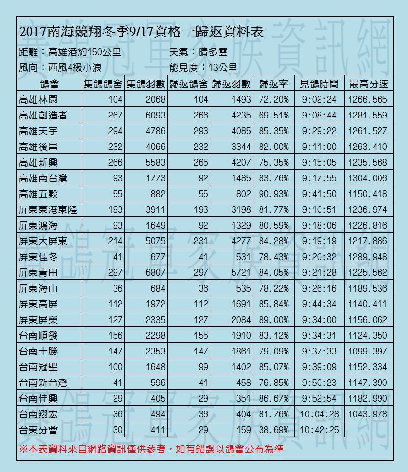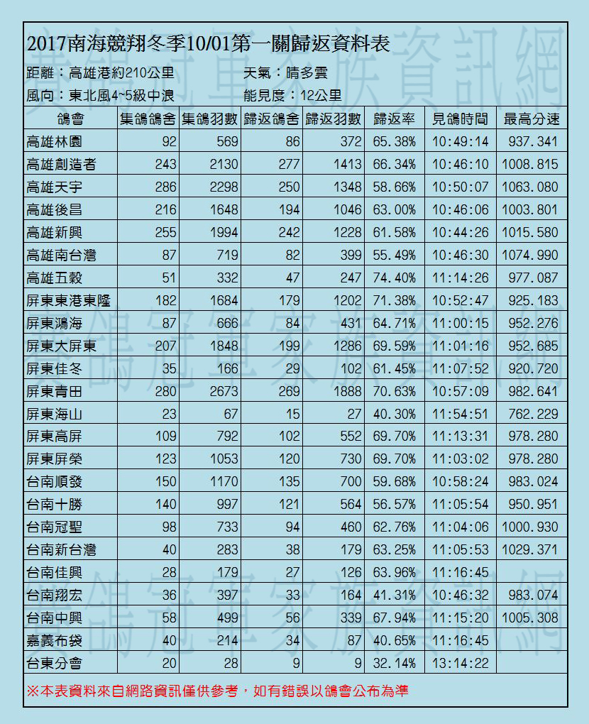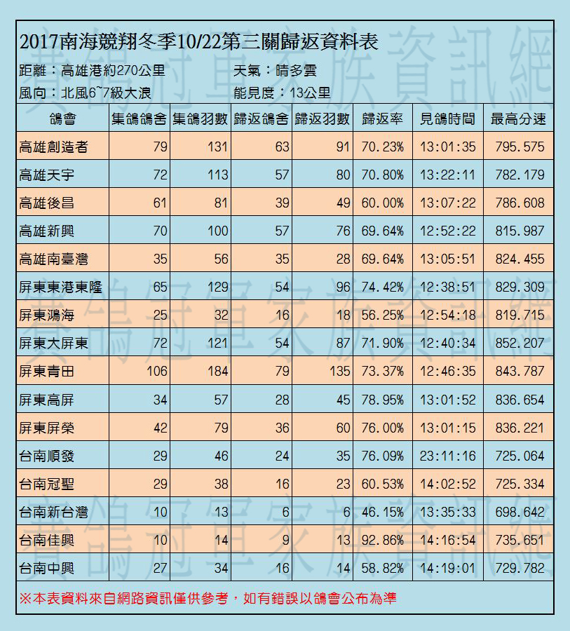 2017年南海競翔冬季各關歸返率一覽表