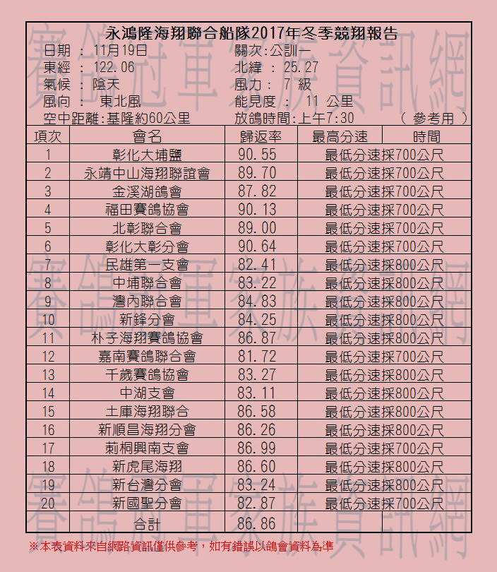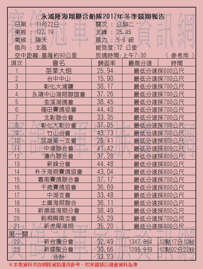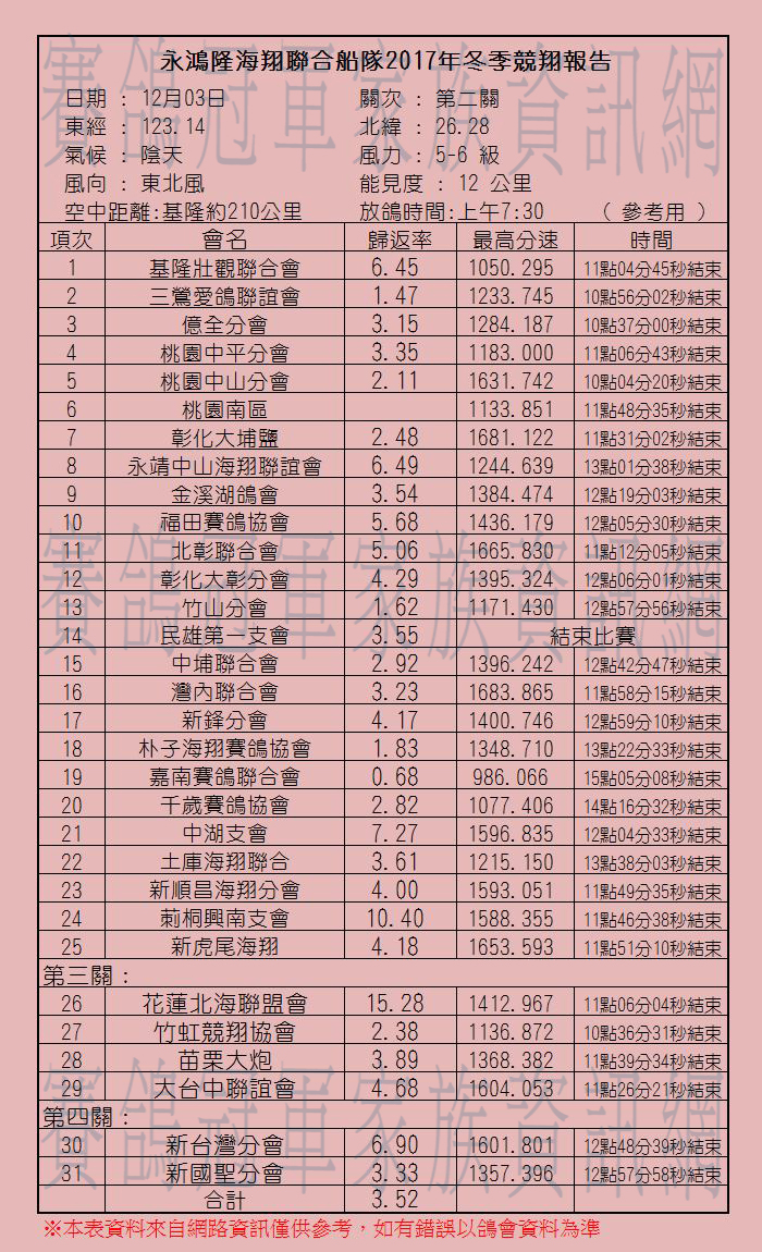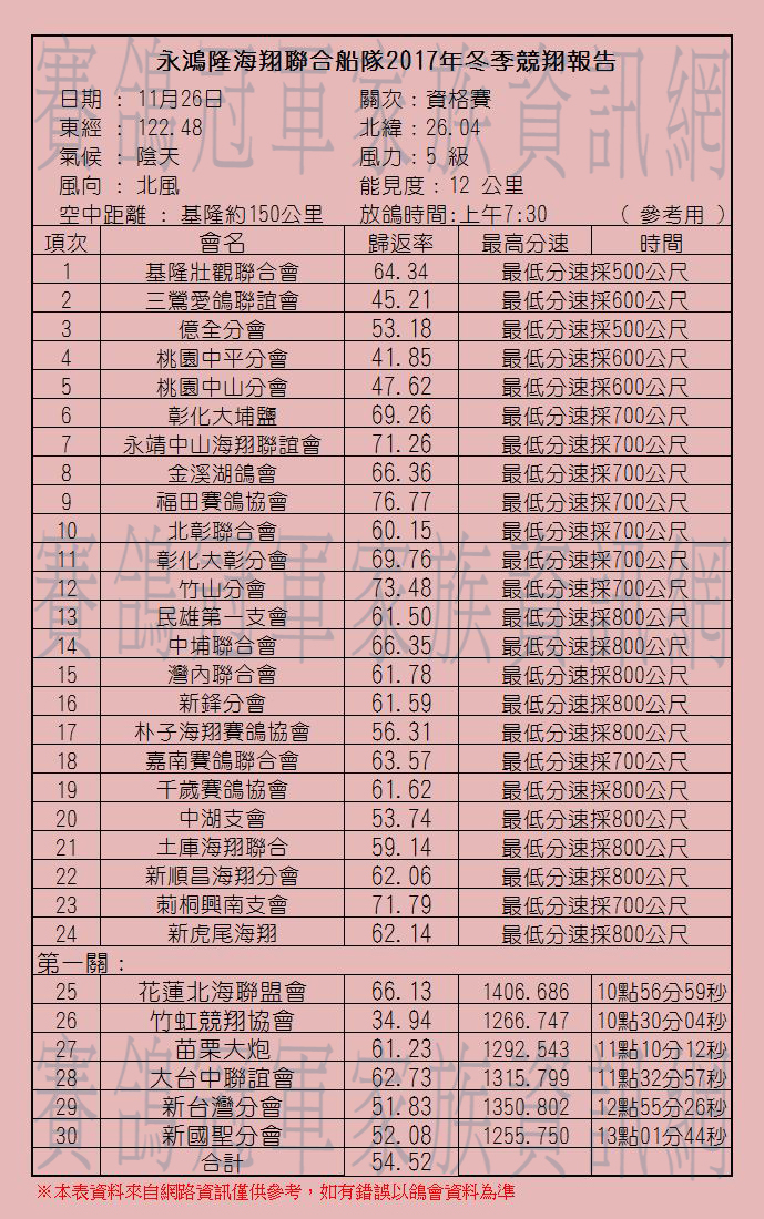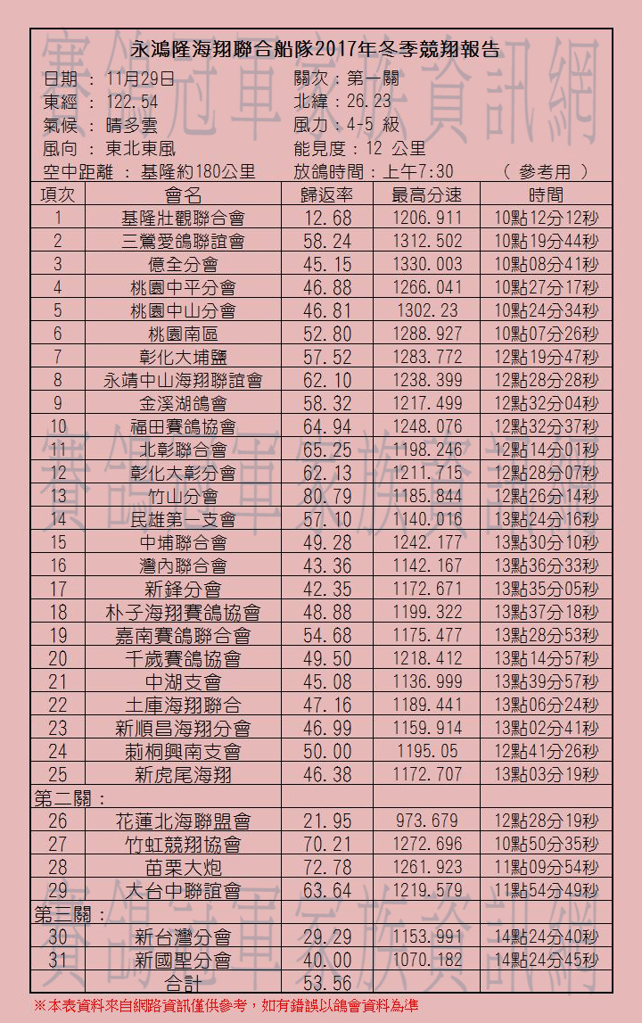 2017年永鴻隆聯合船隊冬季比賽各關歸返率一覽表