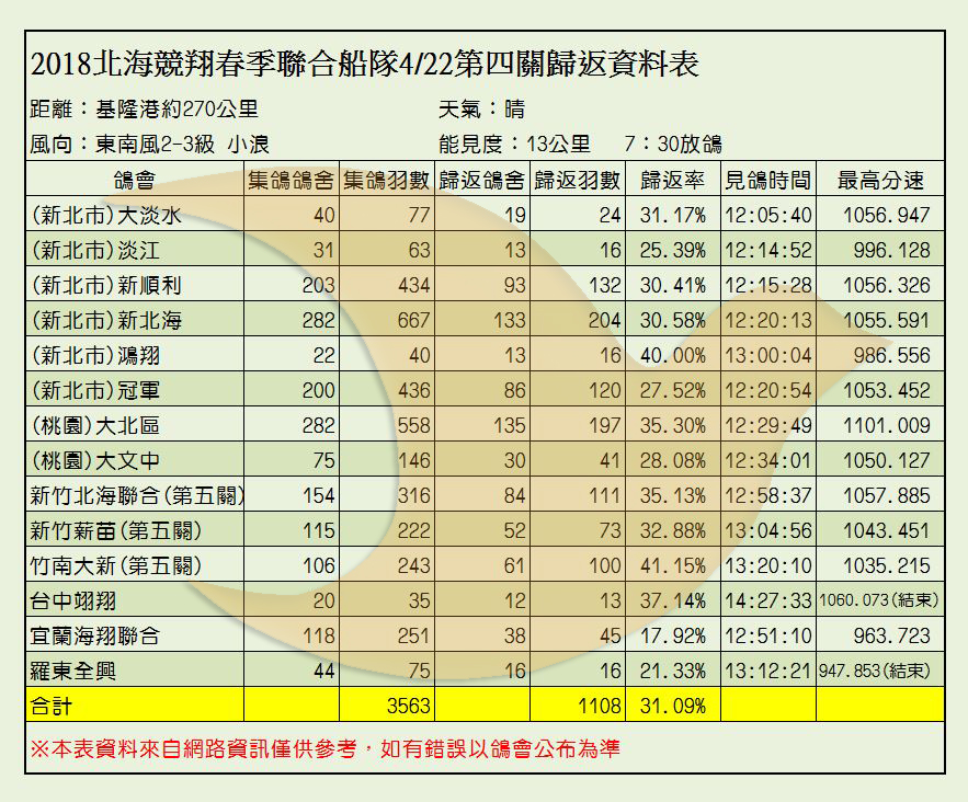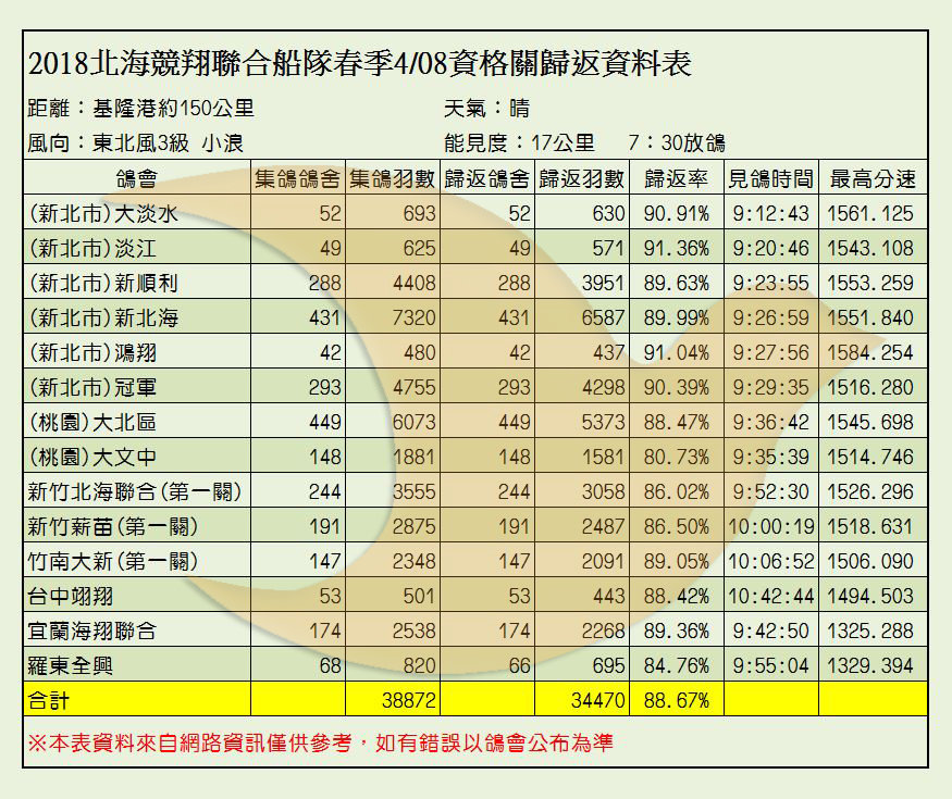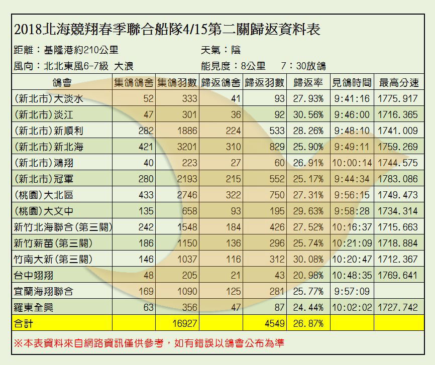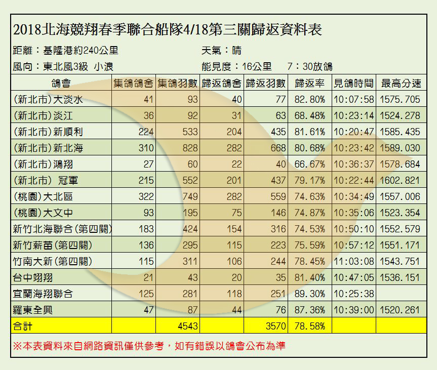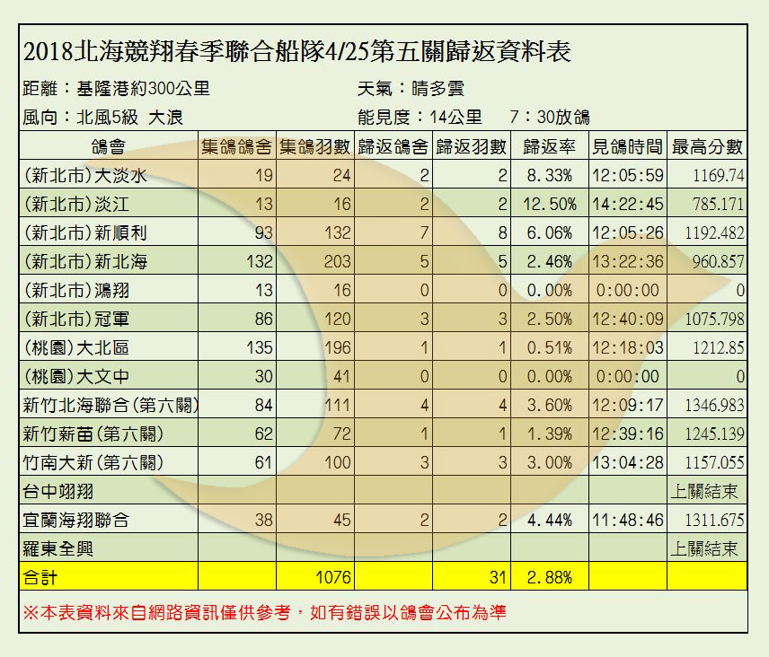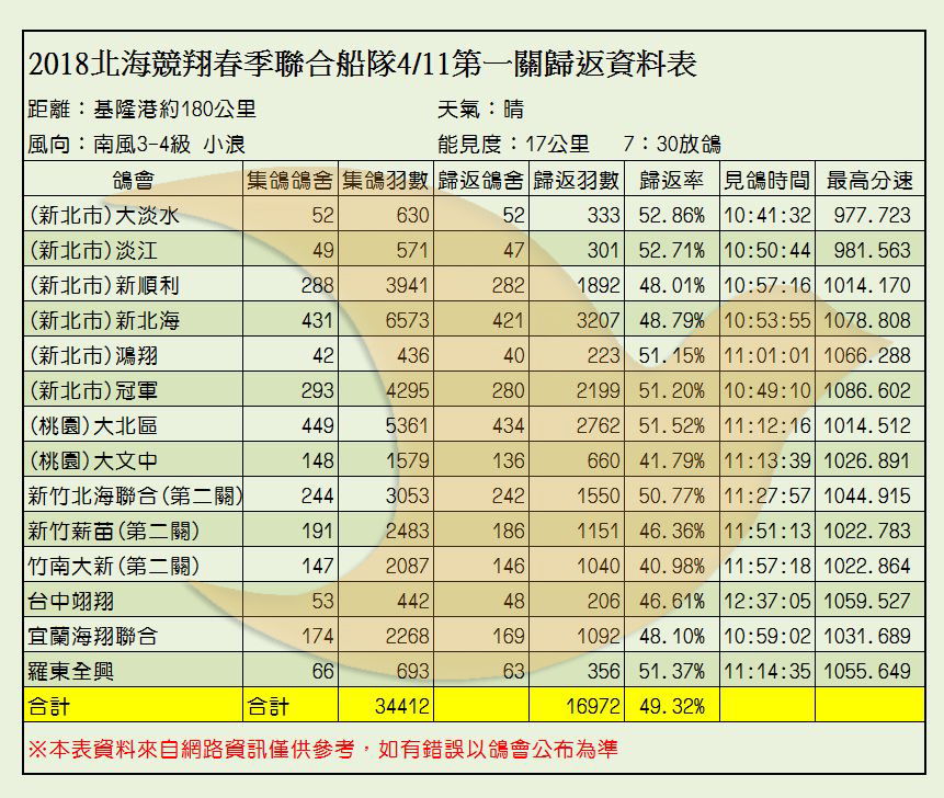 2018年北海聯合船隊春季比賽各關歸返率一覽表