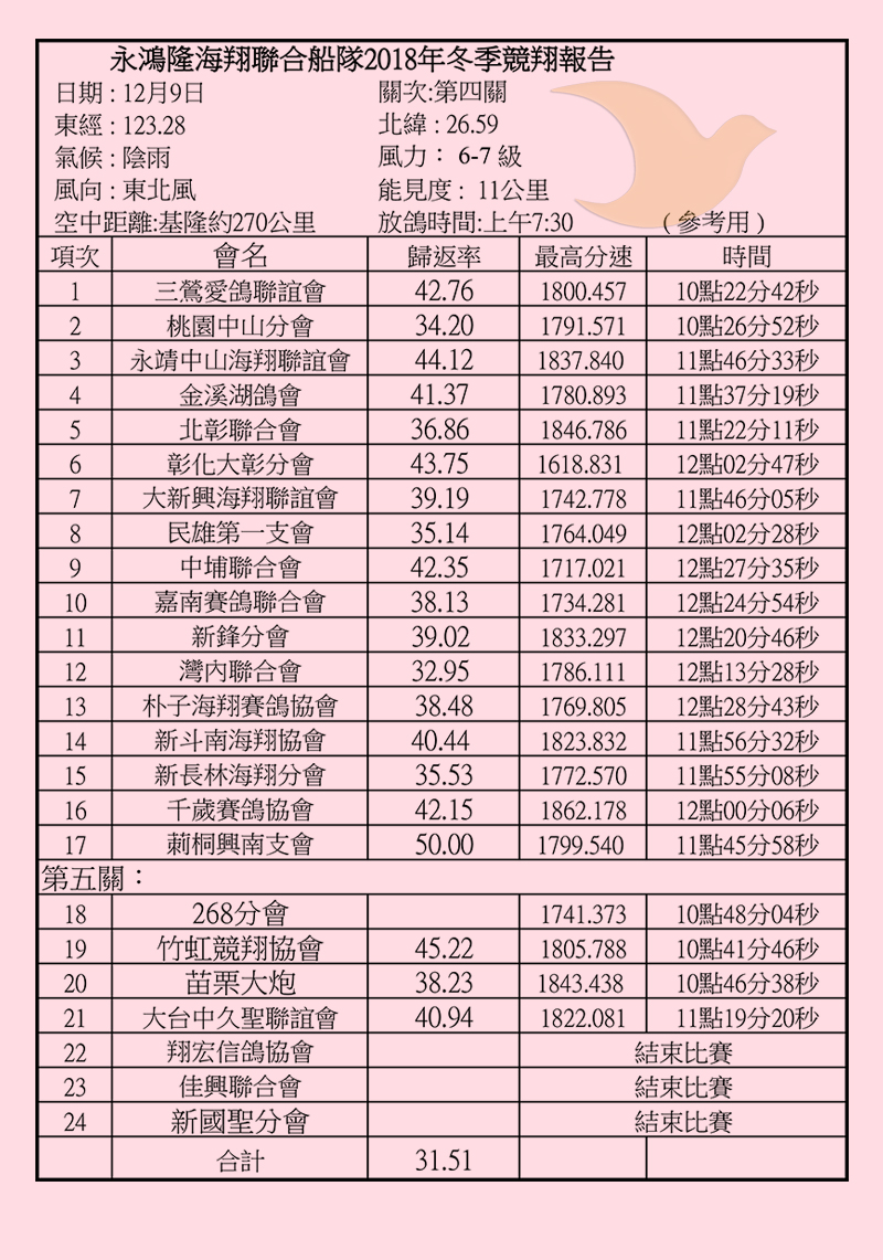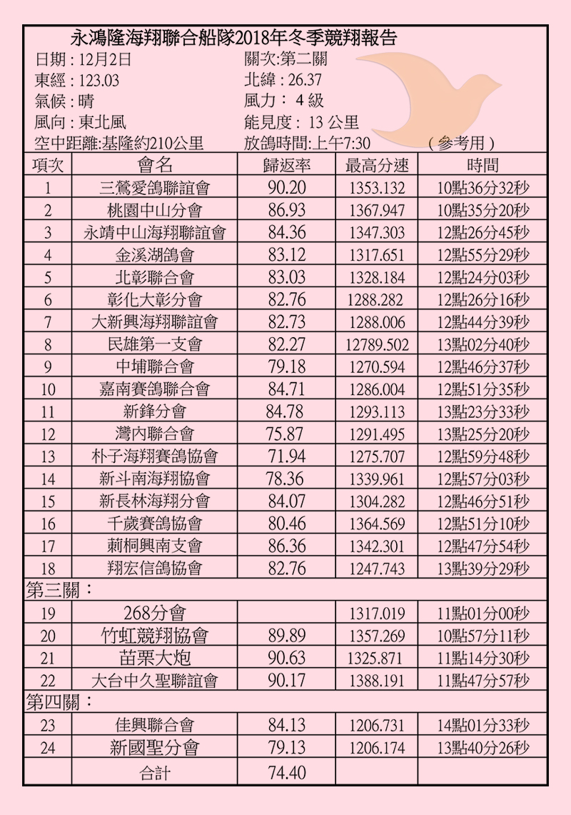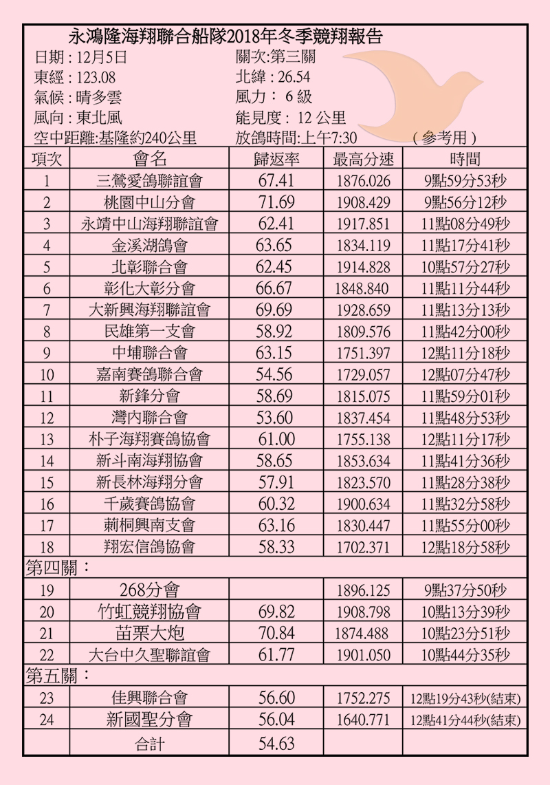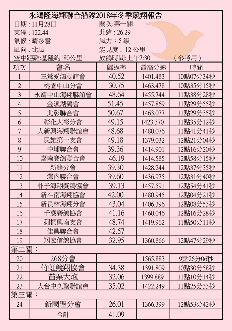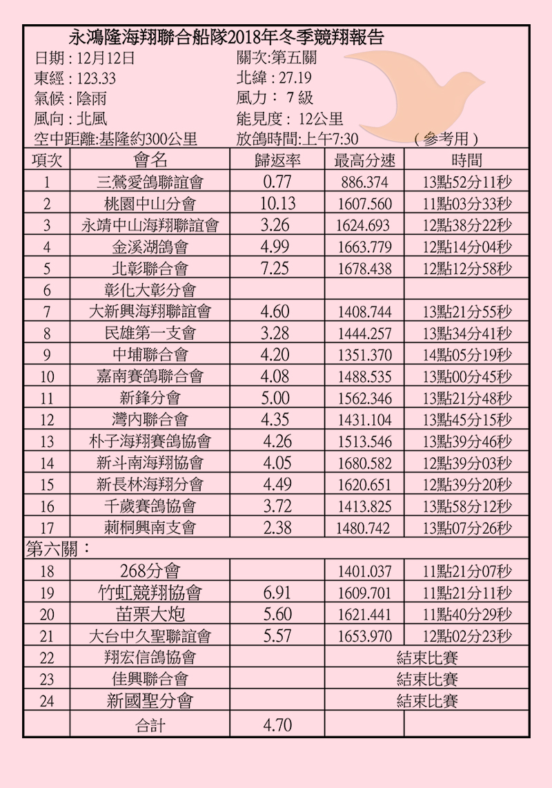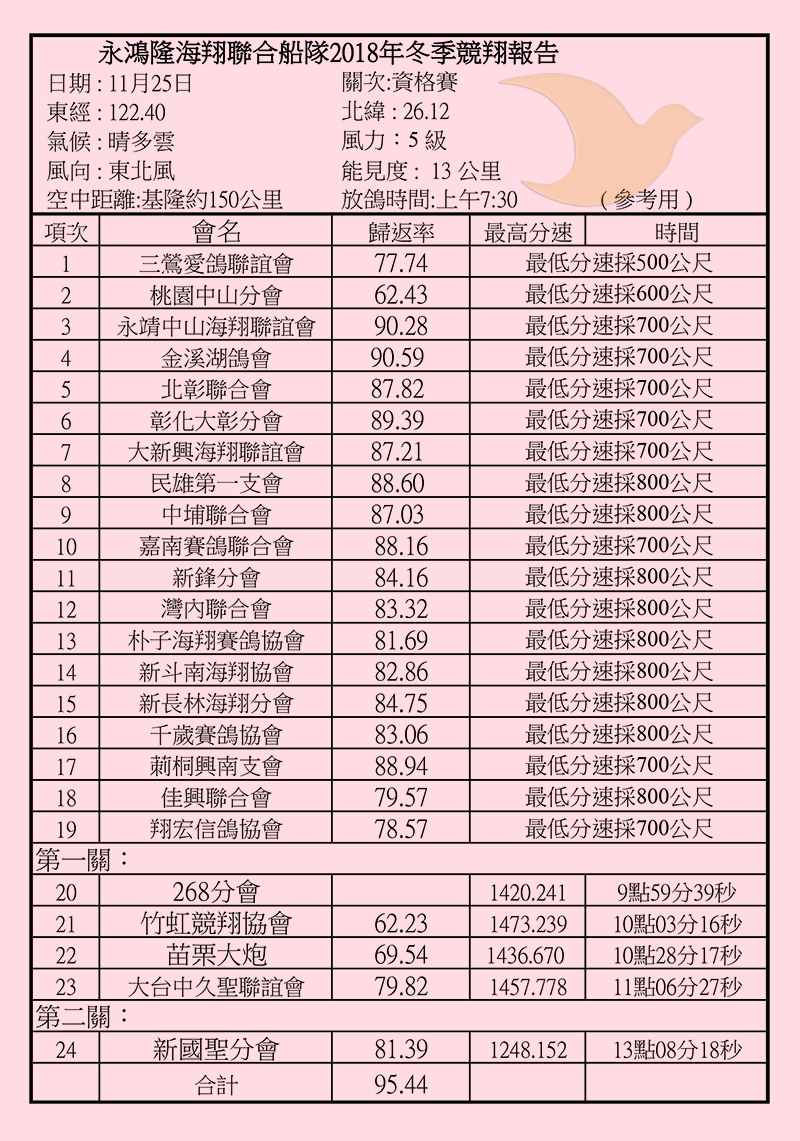2018年永鴻隆聯合船隊冬季比賽各關歸返率一覽表