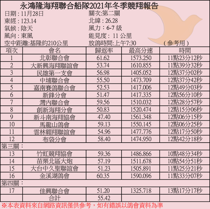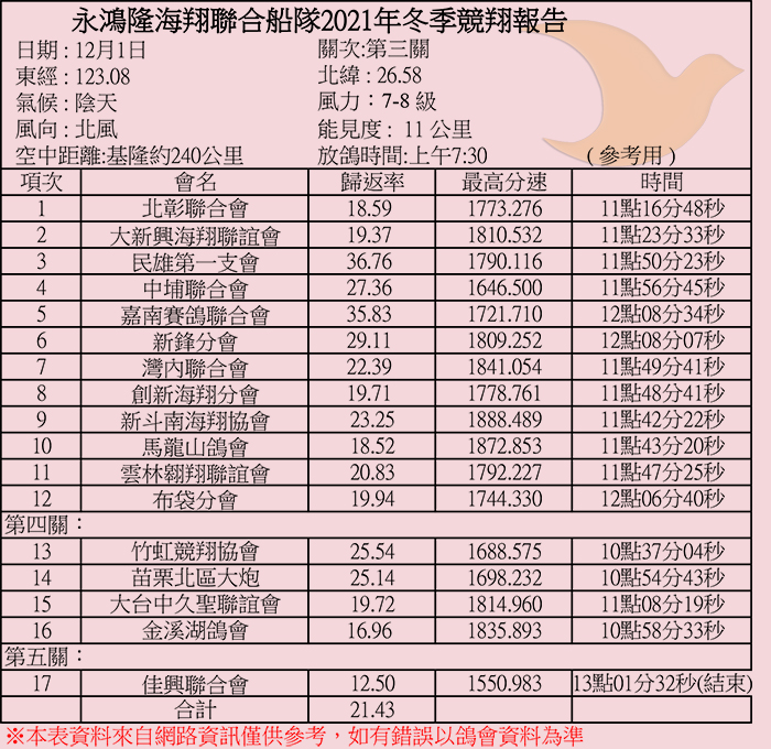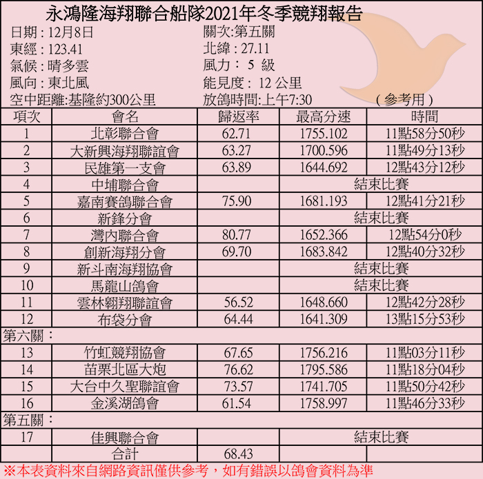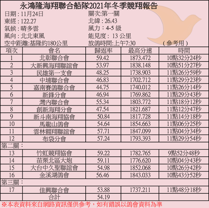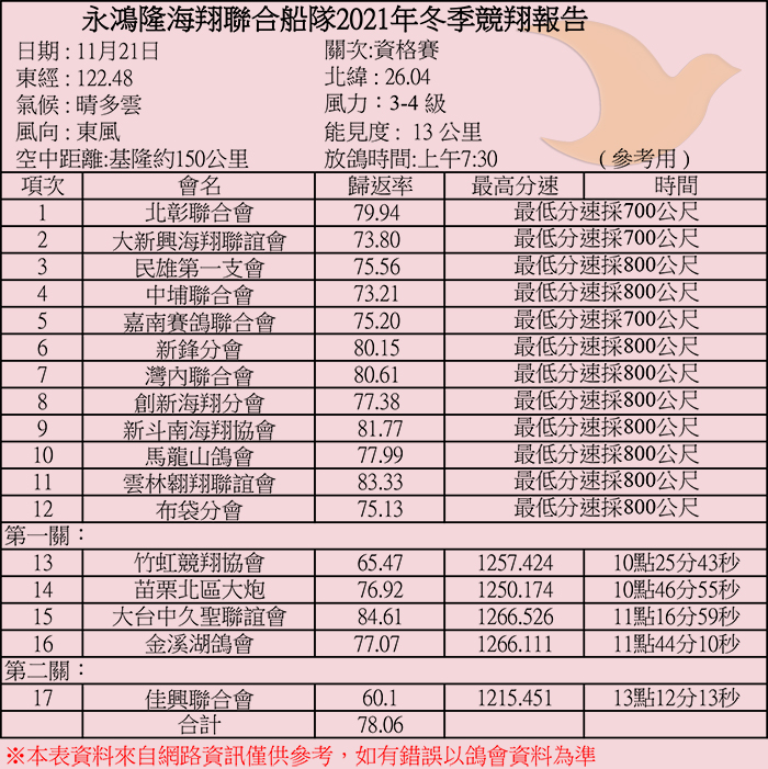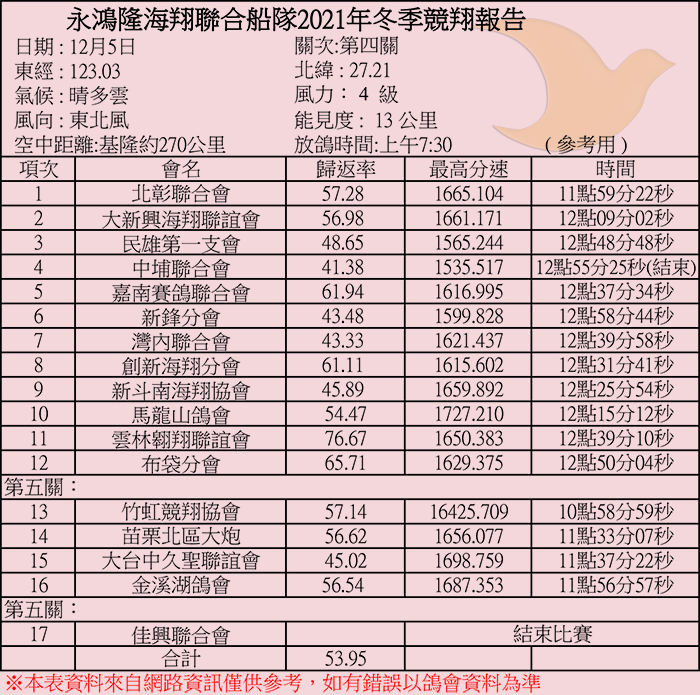 2021年永鴻隆聯合船隊冬季比賽各關歸返率一覽表