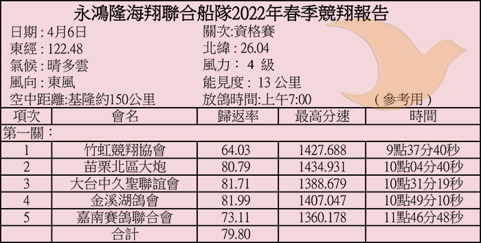 2022年永鴻隆聯合船隊春季比賽各關歸返率一覽表