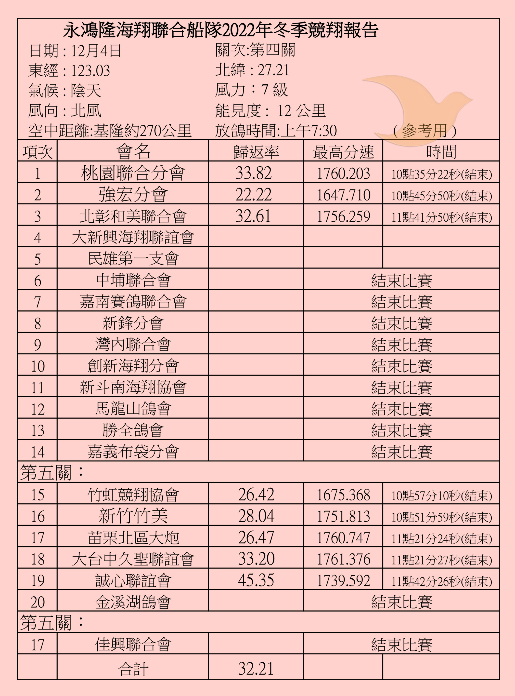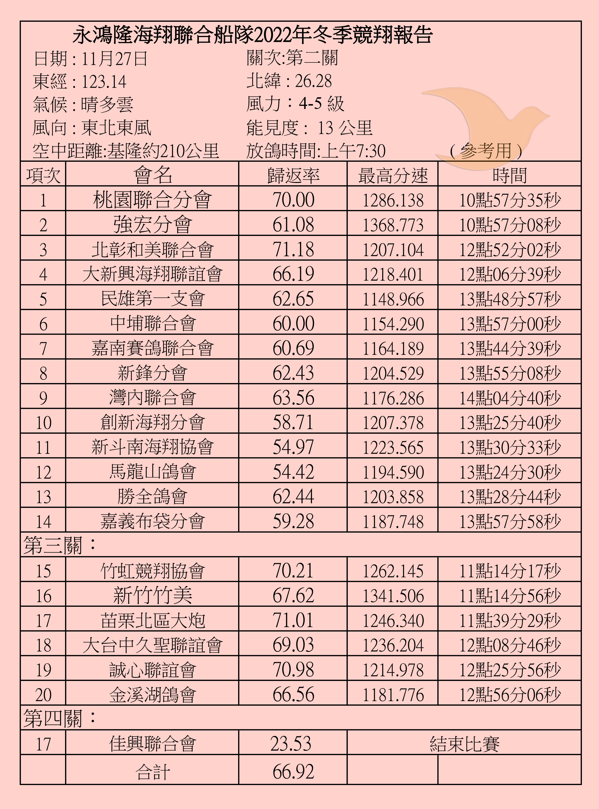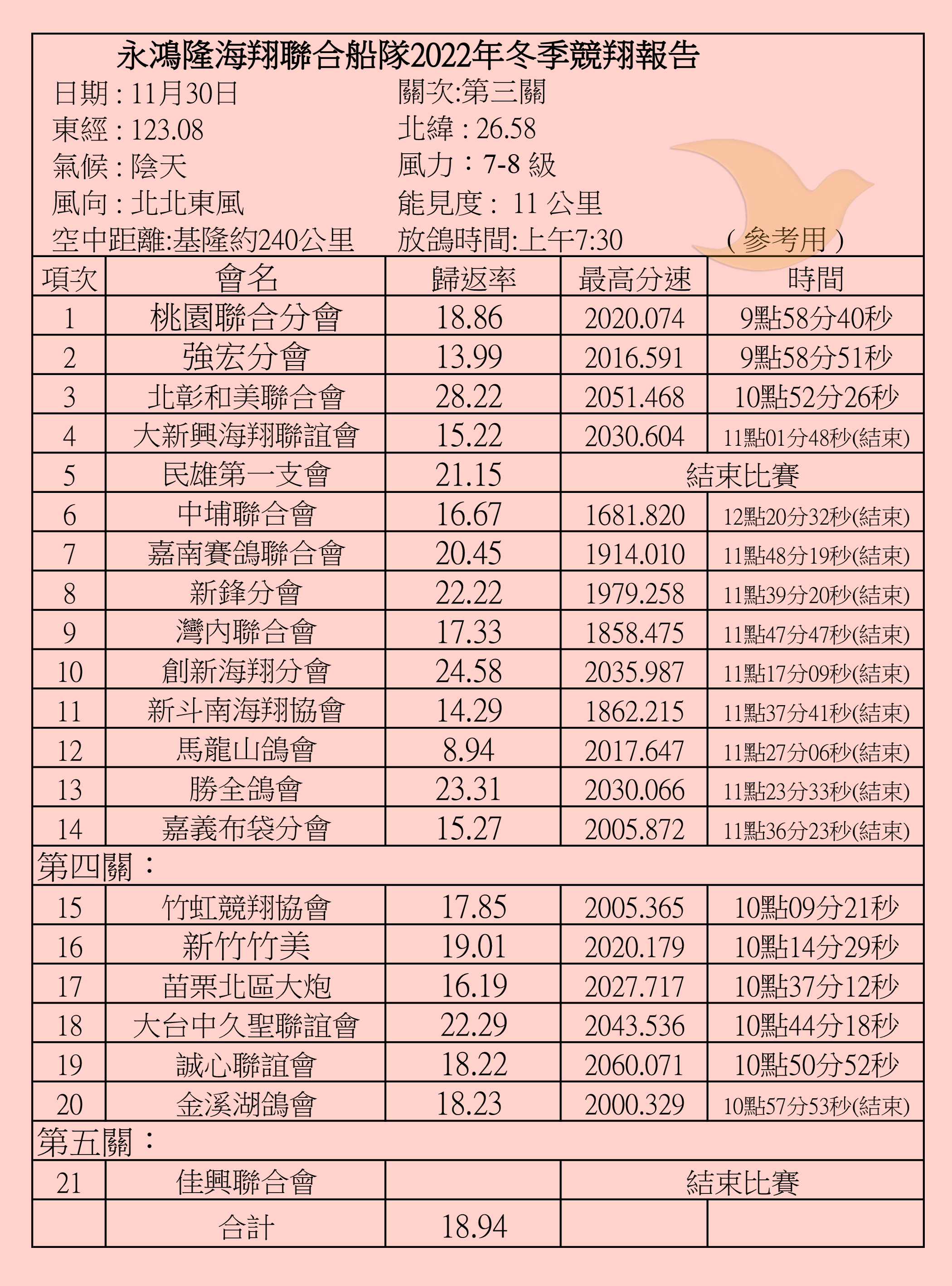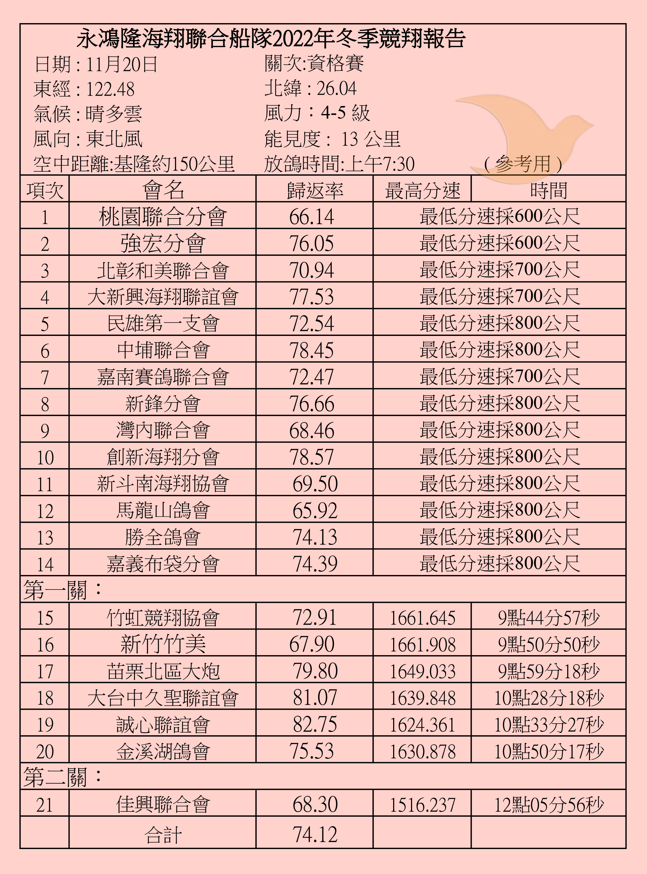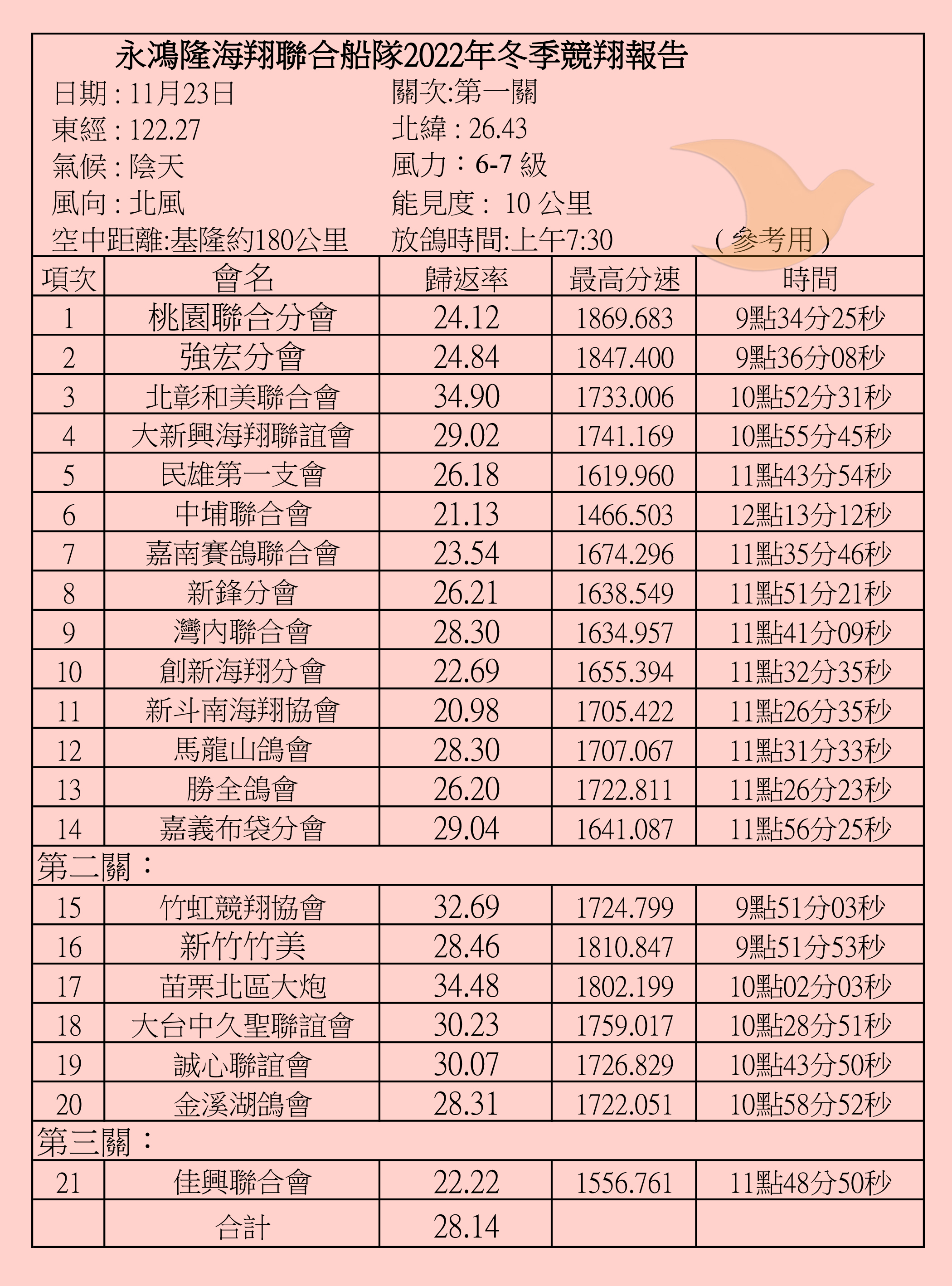 2022年冬季永鴻隆船隊各關歸返率一覽表