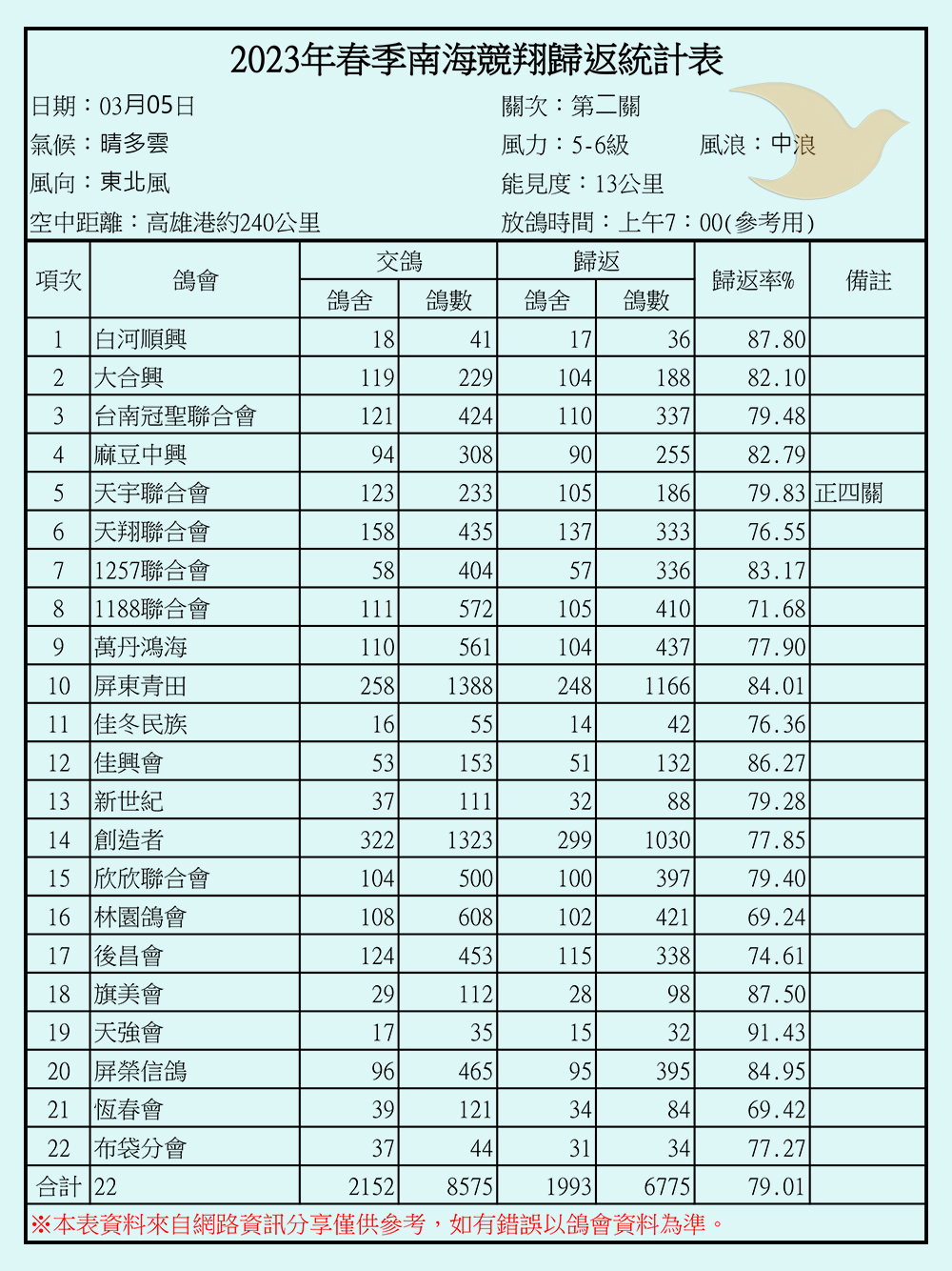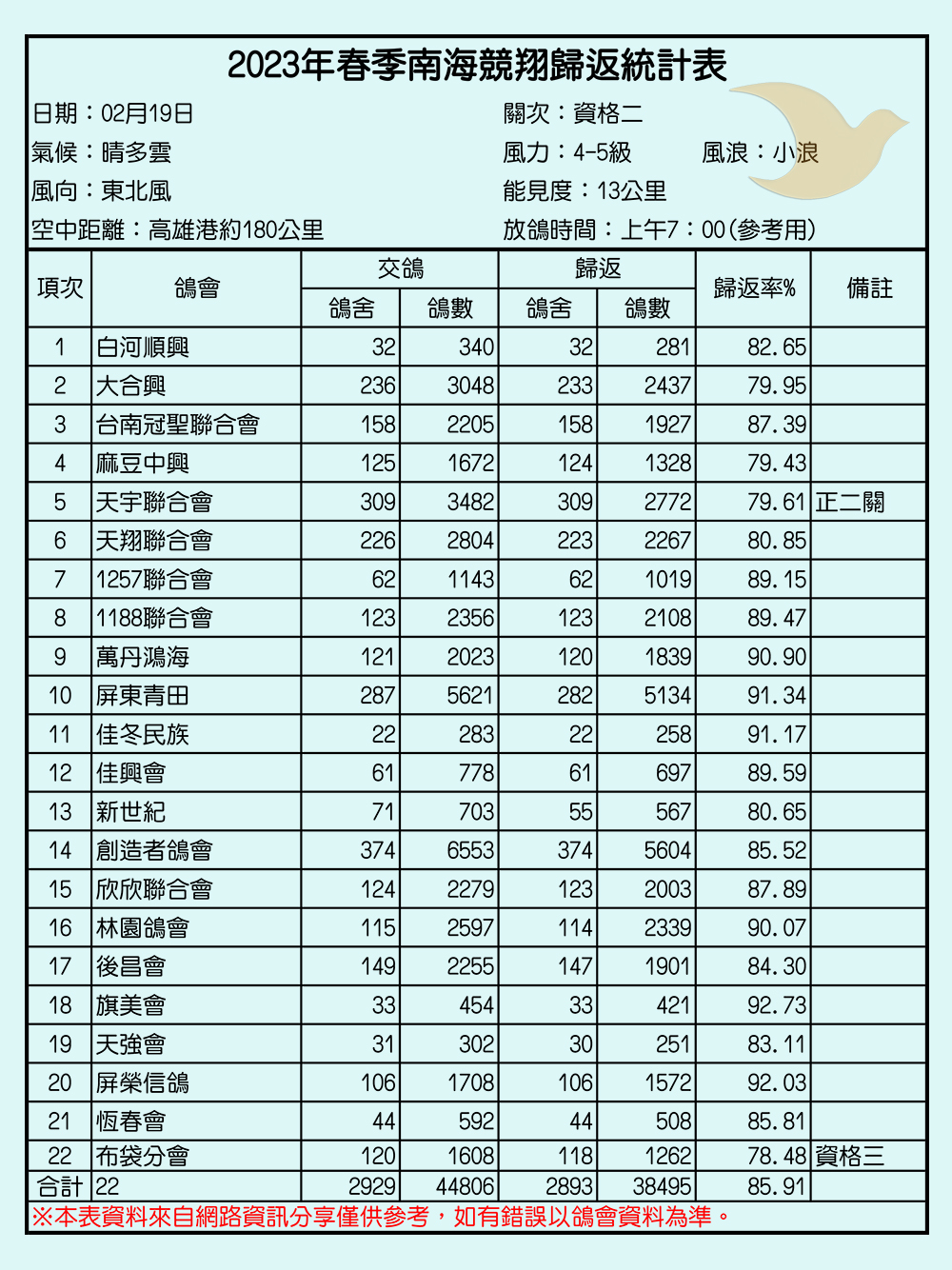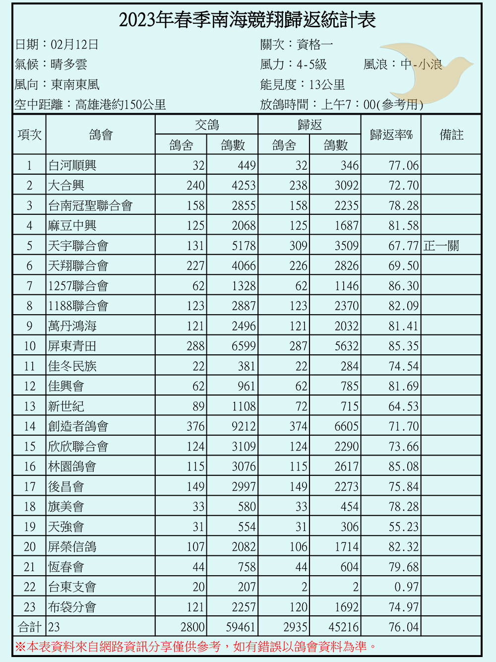 2023年春季南海競翔各關歸返率一覽表