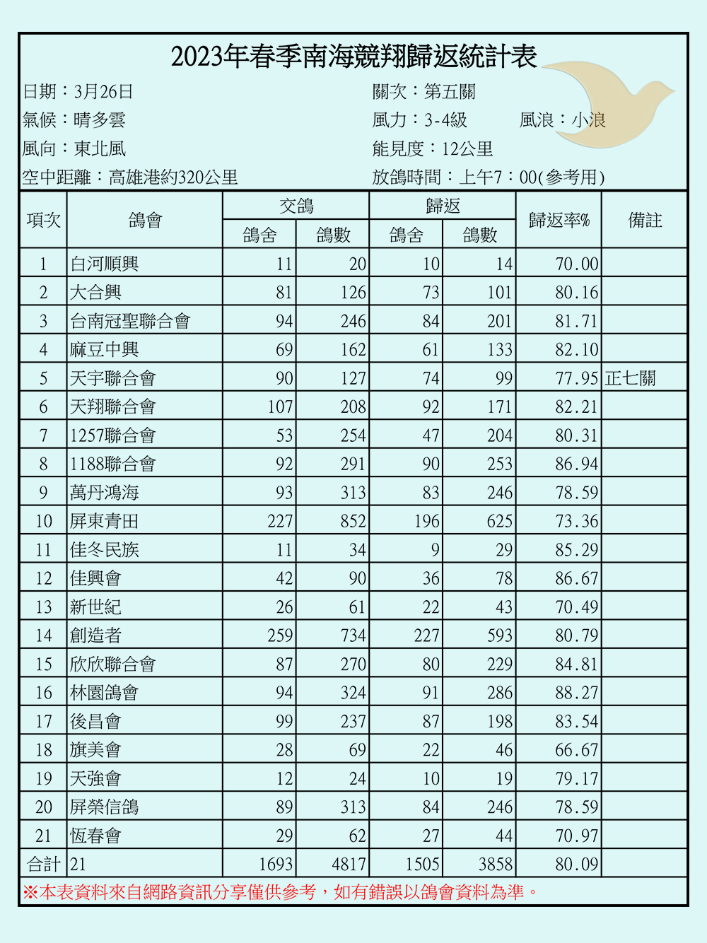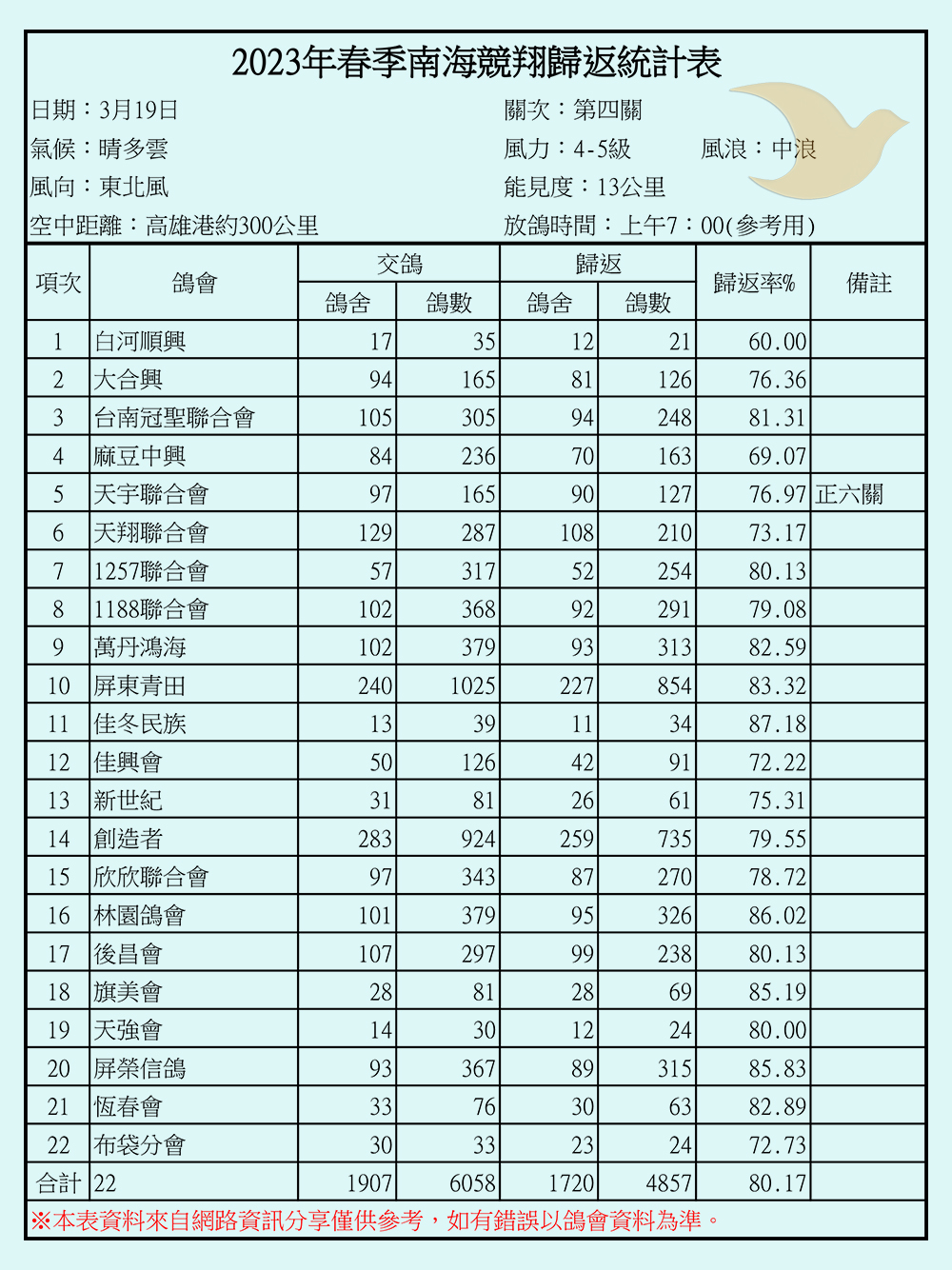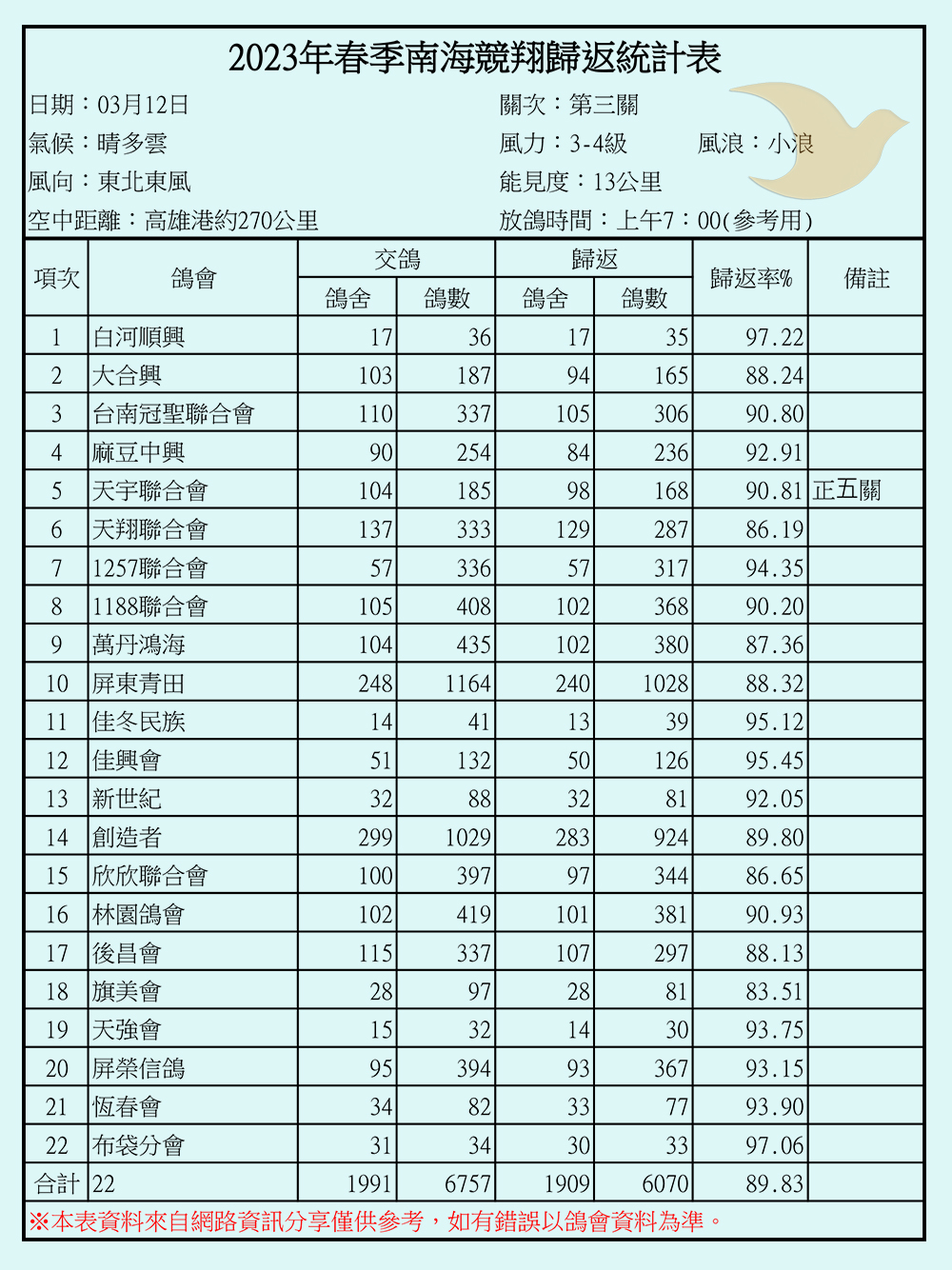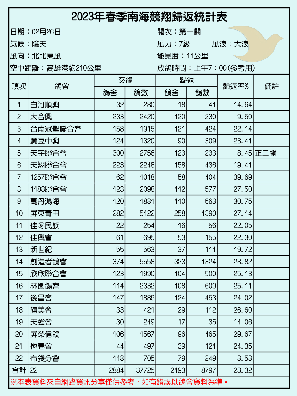 2023年春季南海競翔各關歸返率一覽表