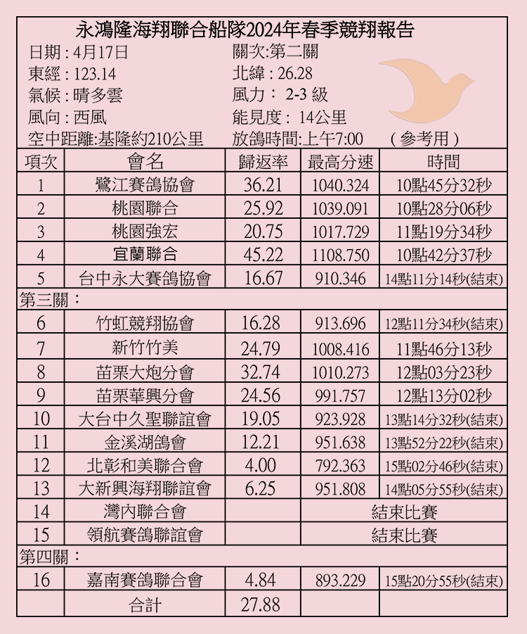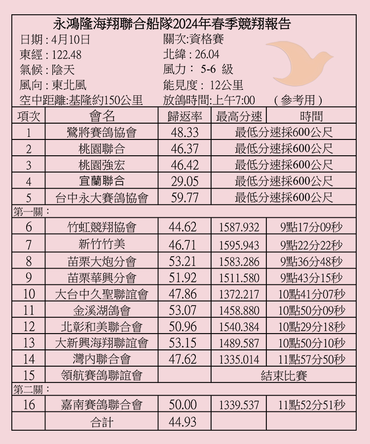 2024年永鴻隆聯合船隊春季比賽各關歸返率一覽表