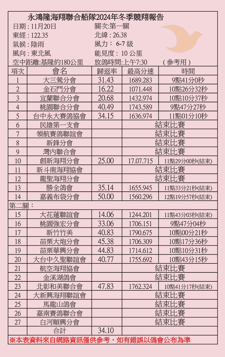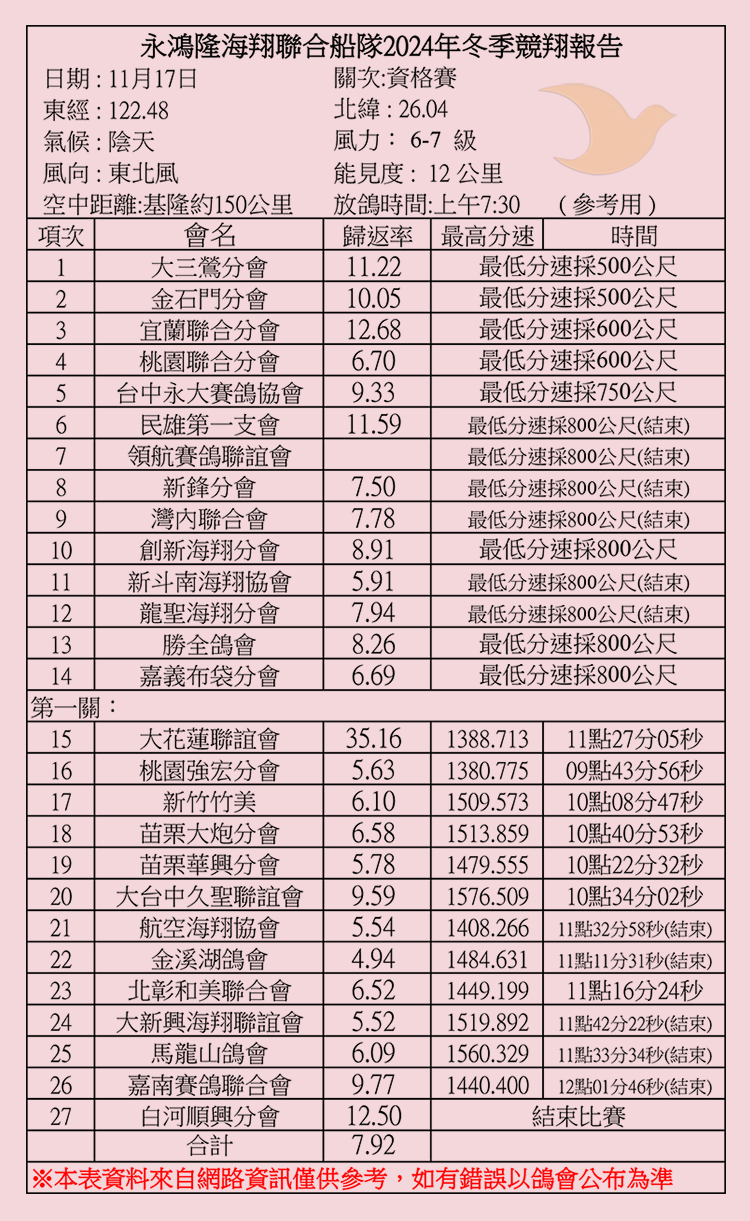 2024年永鴻隆聯合船隊冬季比賽各關歸返率一覽表