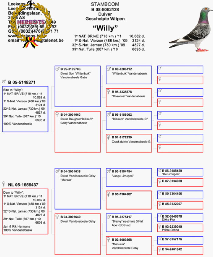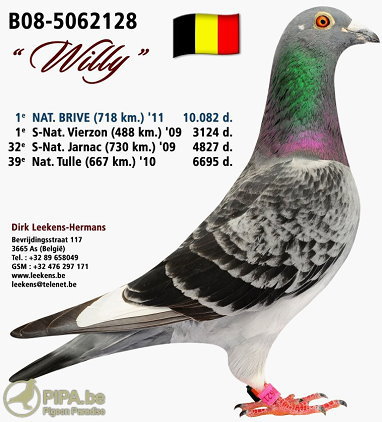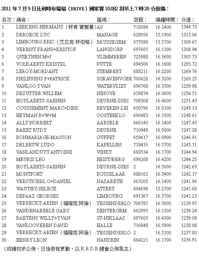 2011年比利時布瑞福(Brive)國家賽於7月6日交鴿,總數10.082羽(成鴿),較去(2010)年10.448羽少了366羽,於7月9日上午7時20分準時放鴿,因氣候良好,歸返率比預期的還好,獲得冠軍的鴿舍為林肯.賀爾曼(LEEKENS-HERMANS)先生,冠軍鴿B08-5062128班白羽公(屬於蓋比白腹號×閃電號)於下午16時14分見鴿,飛行718.084公里,足足飛翔8小時40分,以1344.73公尺/分高分速獲得2011年布瑞福(Brive)國家賽10.082羽總冠軍。