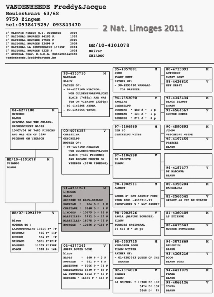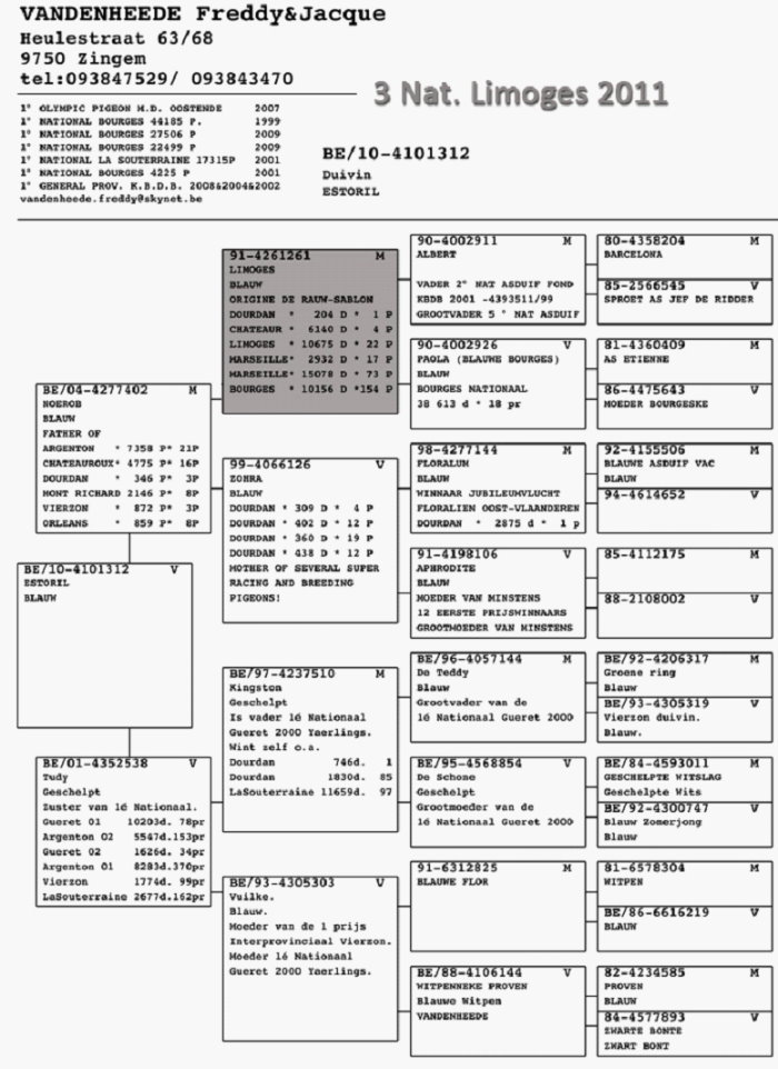 獲得2011年利蒙治一歲鴿國家賽季軍:BE10-4101312灰雌,其血源如下: