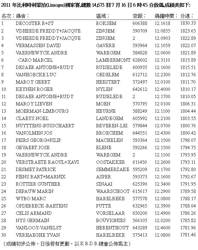 2011年比利時利蒙治(Limoges)一歲鴿國家賽報導:
