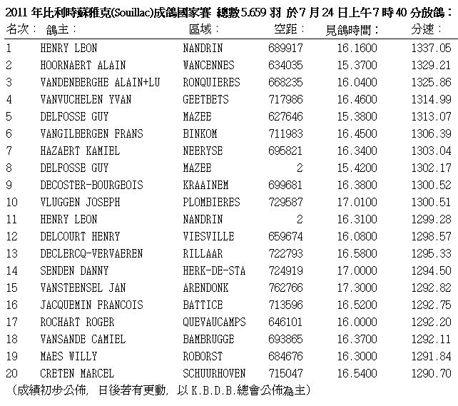 2011年比利時蘇雅克(Souillac)成鴿國家賽約620~750公里,於7月20日交鴿總數有5.659羽比去(2010)年7.045羽少1.386羽,預定於7月23日(星期六)上午放鴿,因氣候不佳延後一日( 24 )(星期日)上午7時40分放鴿。