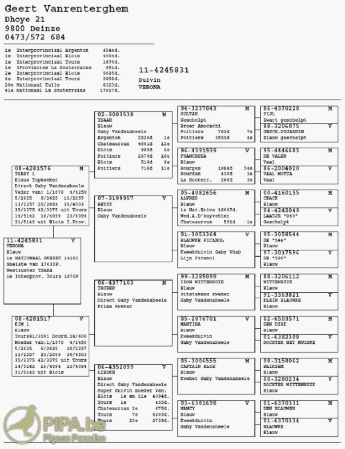 頂級種鴿,蓋比凡德納比原舍鴿!他的子代在杜爾斯和布洛瓦省賽及省際賽中多次獲得前名次,具體如下:
