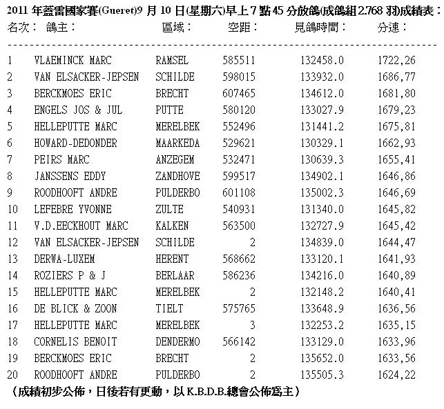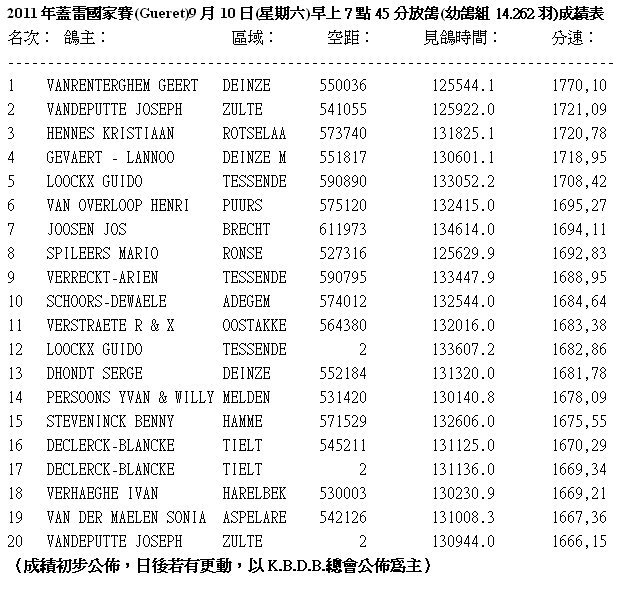 這場蓋雷國家賽前名次鴿友全部來自東弗蘭德省(East-Flanders),成鴿冠軍最終花落安特衛普的馬克.佛萊明(Marc Vlaeminck)之手。