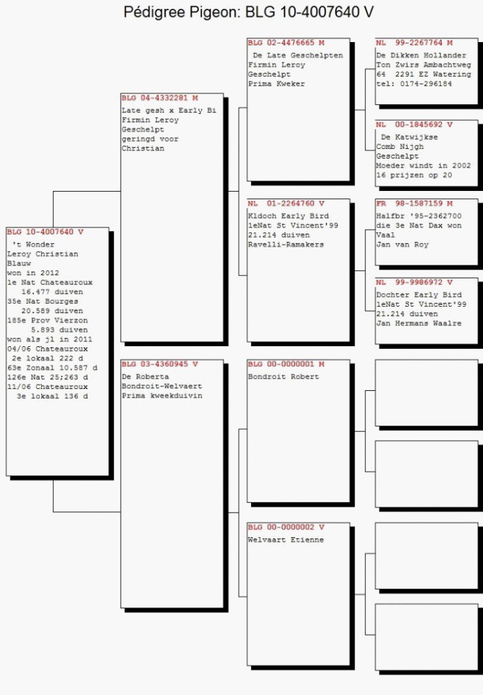 獲得查特盧斯(Chateauroux)國家賽成鴿組16.387羽冠軍,同時也是總數32.281羽(含一歲鴿15.894羽)總冠軍為比利時中距離強豪克里斯汀.勒魯瓦(Christian Leroy)鴿舍,該舍的1羽灰公2010年生B10-4007640以1258.34公尺/分,空中距離483公里,勇奪冠軍,更值得一提的是該鴿在上週也剛獲得波治全國成鴿組20.589羽35位的佳績,實力超強。