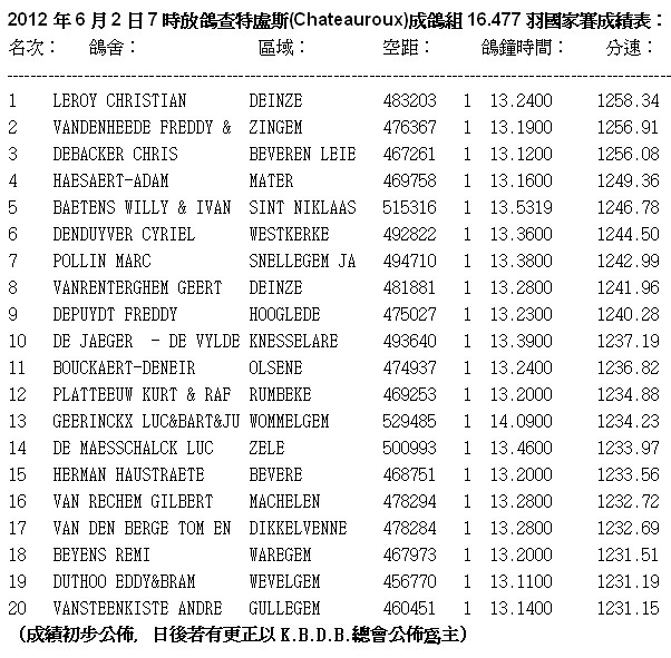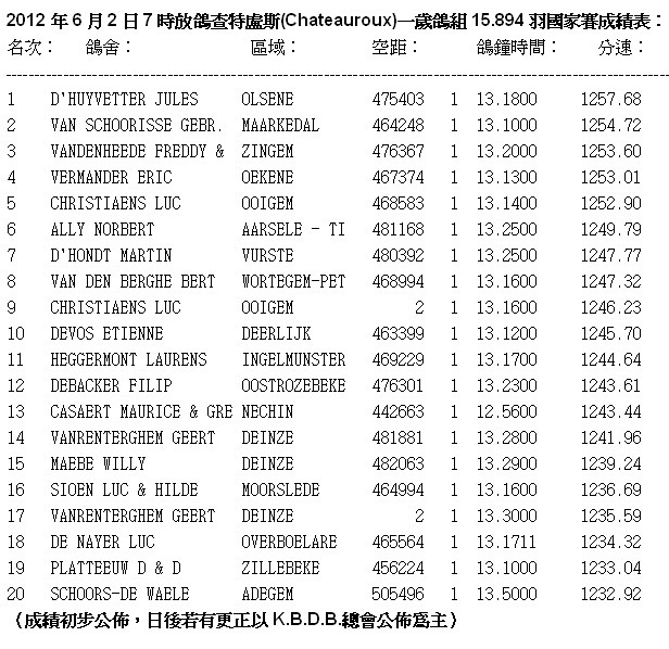 2012年比利時查特盧斯(Chateauroux)國家賽5月31日集鴿完成,距離約480~500公里(含成鴿16.387羽、一歲鴿15.894羽)總計32.281羽,較去(2011)年44.908羽減少12.627羽,於6月2日(星期六)上午7時放鴿,天氣狀況:天空碧藍、晴朗、無風、能見度好。