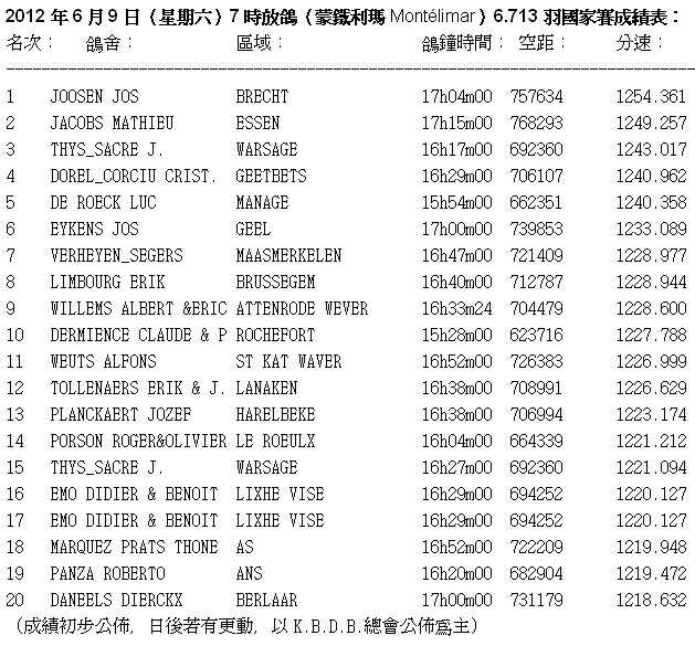 2012年比利時蒙鐵利瑪(Montelimar)國家賽於6月6日交鴿,總數6.713羽,距離約700公里,較去(2011)年8.040羽減少了1.327羽,於6月9日(星期六)上午7時放鴿。天氣狀況:天空碧藍、北風、東南風、能見度非常好、不過必須經過的隆河峽谷有頂風,然後會有強烈的西南風(順風)因此全國冠軍鴿將很可能歸屬比利時東部地區(林堡或者烈日省)或最北端的安德衛普省的鴿友。