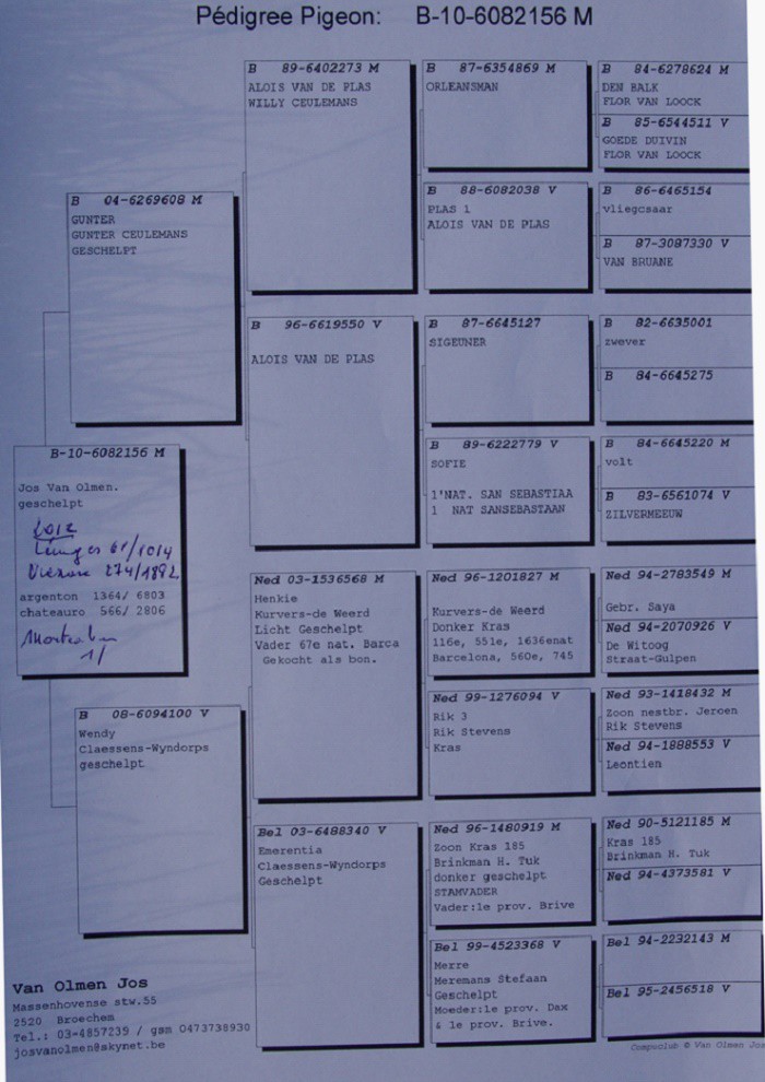 獲得蒙托邦(Montauban)國家賽冠軍為喬斯.萬奧門(Jos Van Olmen)先生;來自布魯海姆區(Broechem),他的2歲斑公鴿取得1292.17公尺/分的平均分速。除此之外,他還獲得前一天的波城安特衛普全省冠軍,這個週末對他來說真是收穫頗豐!