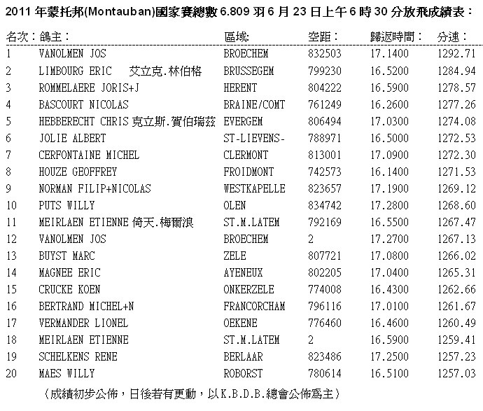 2012年比利時蒙托邦(Montauban)國家賽,空中距離約780公里,於6月20日交鴿,於6月23日早上6時30分放飛,今年交鴿總數6.809羽比去(2011)年9.091羽少了2.282羽。>>放鴿地位置圖