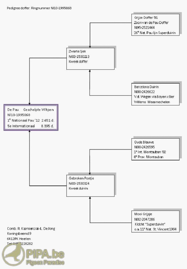 獲得2012年波城國際賽,荷蘭全國2.651羽冠軍(國際賽8.399羽第5位)為來自海爾倫(Heerlen)區的卡茲米爾恰克-德容(Kazmierczak-De Jong)鴿舍,該舍的冠軍鴿NL10-1995068灰班母,以平均分速為1539.35米/分獲得荷蘭全國冠軍(國際賽第5位)佳績。