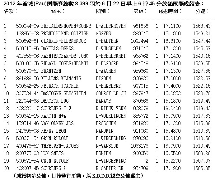獲得波城國際總冠軍為德國的長距離強豪鴿舍福登霍芬父子(Freialdenhofen & Sons )鴿舍,冠軍鴿DV06348-10-196灰公,以平均分速為1568.428公尺/分獲得2012年第一場國際比賽波城(Pau)賽的國際8.399羽總冠軍。