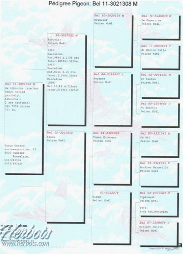 獲得比利時萊邦納(Libourne)一歲鴿國家賽7.958羽冠軍者為來自魯瑟拉勒的傑拉德.薩恩(Gerard Samyn)鴿舍的一歲公鴿B11-3021308班公,以1646.43 公尺/分 的平均分速獲得2012年萊邦納國家賽一歲鴿總冠軍。