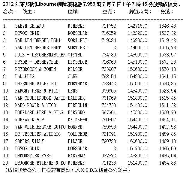 2012年比利時萊邦納(Libourne)一歲鴿國家賽,於7月4日交鴿7.958羽較去(2011)年8.280羽少了322羽,7月7日(星期六)早上7時15分放鴿。