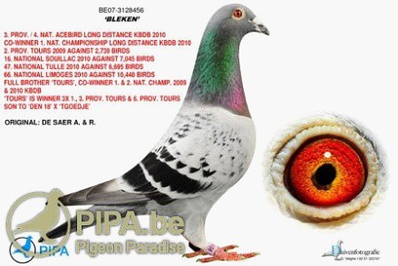 獲得2012年比利時蘇雅克(Souillac)成鴿國家賽冠軍者為來自雷塞萊德(Ruiselede)區的魯迪.狄薩爾(Rudi De Saer)鴿舍,冠軍鴿B10-3020860斑公,在下午16點40分完成打鐘,飛越空距698.942公里,平均分速為1203.48公尺/分。