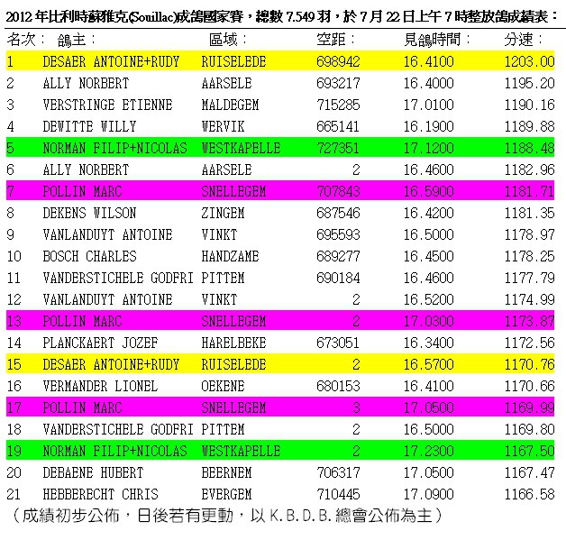 2012年比利時蘇雅克(Souillac)成鴿國家賽約620~750公里,於7月18日交鴿總數有7.549羽比去(2011)年5.667羽增加了1.882羽,預定於7月21日(星期六)上午要放鴿,因天氣不佳延後一日(7月22日星期日)上午7時整放鴿。