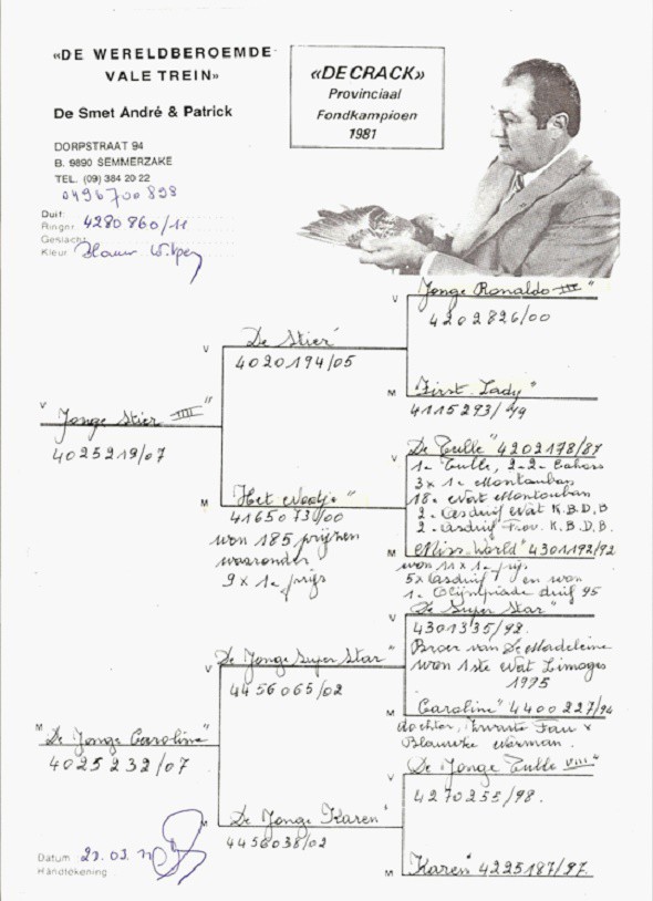 2012年成績:波爾多比利時全國4.971羽363位,拿邦國際賽成鴿組9.072羽冠軍。