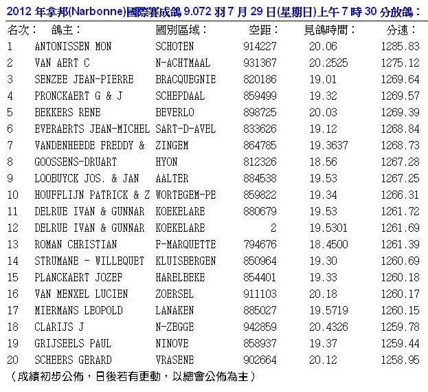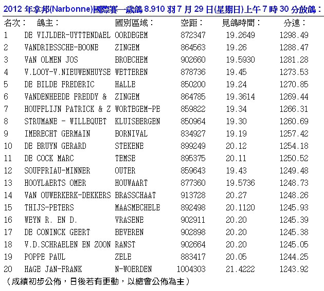 2012年拿邦(Narbonne800~1000公里)國際賽於7月25日交鴿,總數24.082羽(含比利時13.579羽,法國4.613羽,德國1.516羽,荷蘭4.303羽,盧森堡71羽,較去(2011)年22.571羽多了1.511羽,預定於7月28日(星期六)上午要放鴿,因天氣不佳延後一日,於7月29日(星期日)上午7時30分放鴿。