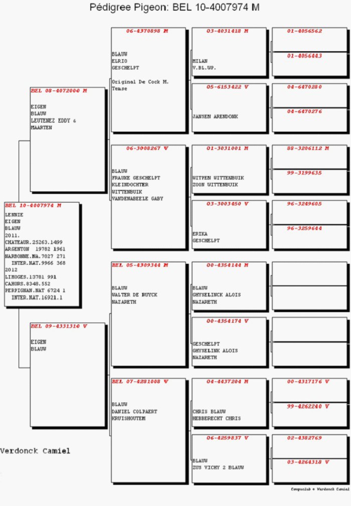 獲得2012年培品納國際賽16.921羽總冠軍為比利時的卡米爾.韋爾東克(Camiel Verdonck )鴿舍,他的冠軍鴿B10-4007974灰公,打鐘時間為下午18時55分,以1261,04公尺/分的分速飛越908,645公里的空中距離。