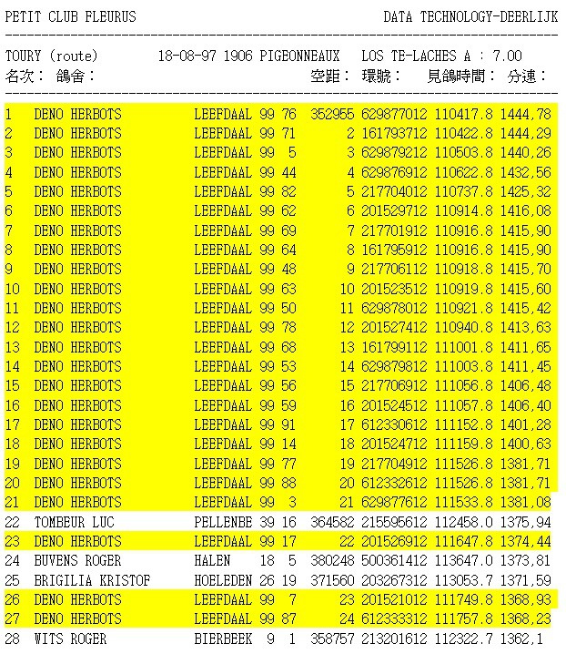 過去1997年8月18日老傢伙迪諾.賀伯特也同樣在同一地點同一距離”圖利”(Toury 350公里)的情況下,參賽鴿1.906羽於早上7點放鴿,也創下前頭批鴿21羽的名次全包了的非凡記錄。