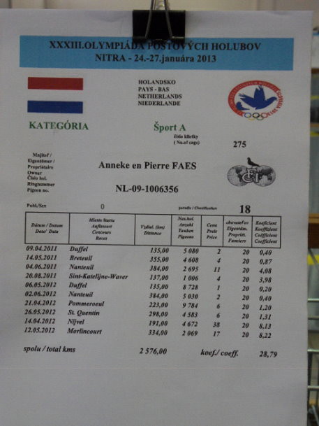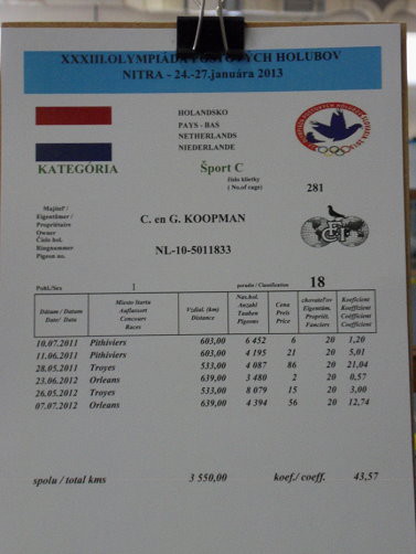 在這次鴿展中,不但有我的“傑瑞森”參展而且還有我新引進的一羽超級雌鴿。她是“海蓮娜”短距離奧林匹克賽績鴿。百分百我的考夫曼血統。我相信有了“海蓮娜”,對我這個血系速度上的提升相信會更上一個臺階。等到這次鴿展結束後,我想用“傑瑞森”配對我的“海蓮娜”試試,相信這一定是我的最新完美配對,我對這個配對充滿了信心!哈哈!相信2013年的荷蘭賽事,這個配對的子代一定會是一個亮點!