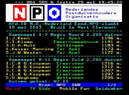 大家最近好嗎,聽說中國的H7N9禽流感現已解除。希望大家的愛鴿一切都好。我這邊有一個好消息要告訴我的愛好養鴿朋友們!我在上週六迎來了我期待了3年的勝利,我獲得了荷蘭成鴿NPO布瑞爾485公里4.564羽賽事的勝利!我有6羽愛鴿排名前10名!名次分別為1名,2名,3名,4名,6名,8名!這仗打的我十分滿意的。三年的付出與失敗終於換來了一聲期待已久的呼喊!我成功了!
