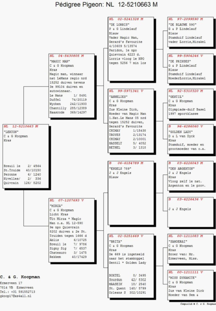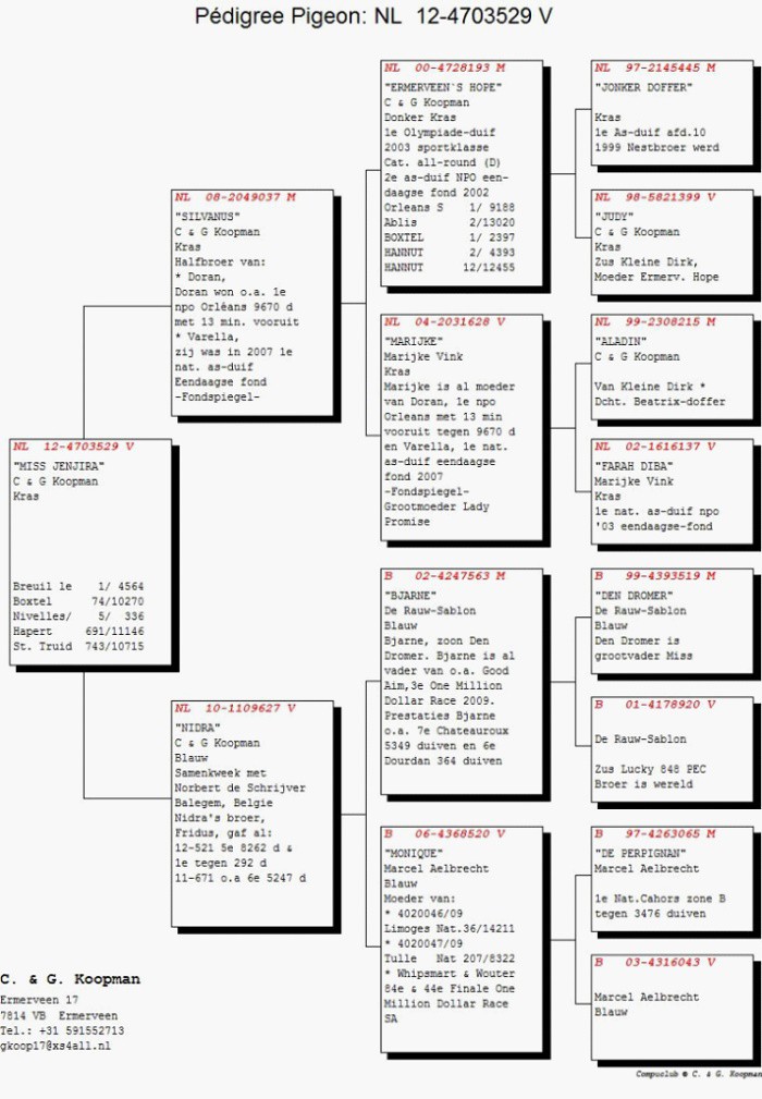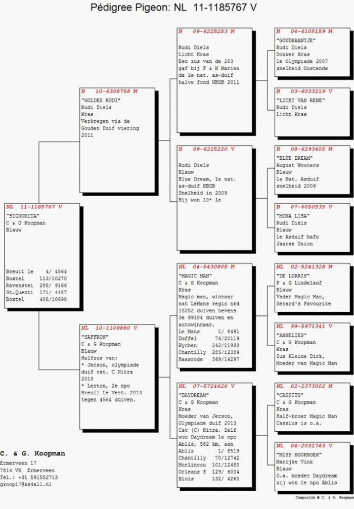 母親則是小迪克的半兄妹芭茲伊拉(NL00-1211002)。本身榮獲依坦姆斯(Etampes)581公里16名/9.679羽;艾碧利斯(Ablis)586公里16名/13.020羽;奇梅(Chimay)345公里2名/4.149羽;哈奴特(Hannut)1名/4.393羽;尼格尼斯(Niergnies)1名/10.158羽。