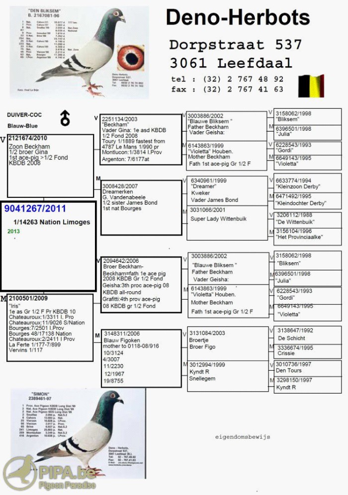 獲得2013年利蒙治全國賽(成鴿)14.263羽冠軍:巴斯考特 尼古拉(Bascourt Nicolas)鴿舍,冠軍鴿是在比利時時間星期六16:22:52秒返舍,空中距離607.043 km, 創下平均分速1139.2 米/分。