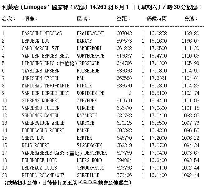 2013年比利時利蒙治(Limoges)成鴿國家賽報導: