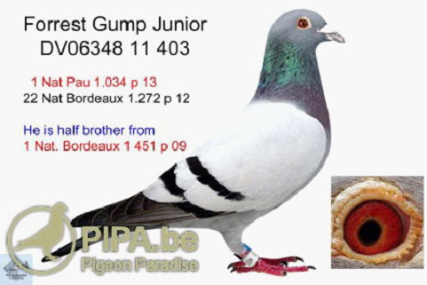每次當我們看獲獎鴿的血統時總是很有趣。冠軍鴿DV06348-11-403是一羽灰雄,我們對它並不陌生,它在2012年賽季中已經獲得了許多頂尖戰績。其中包括:波爾多全國1.272羽22位、國際10.622羽166位,拿邦國際11.000羽1674位。如今在2013年,它更是加冕了全國冠軍的寶冠。在賽鴿運動中從來不會無中生有。他們全國冠軍的父親是著名的“阿甘號”(Forrest Gump)DV06348-00-789,曾獲2002年國際鴿王季軍的頭銜,並且做出許多知名的鴿王及冠軍鴿。“阿甘號”出自“馬克斯”(Max)NL97-2039867x範登波爾-巴克利家族做出的“848號”(De 848)直女BE96-2270528,是一羽真正的高水準賽鴿及種鴿。