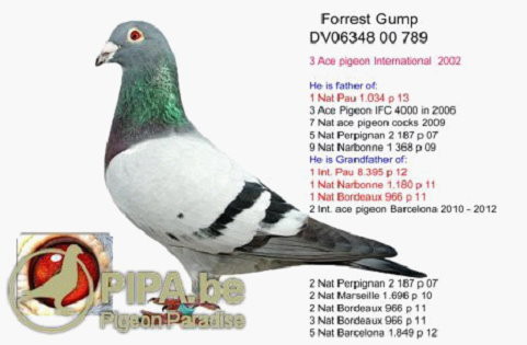“阿甘號”(Forrest Gump)DV06348-00-789,曾獲2002年國際鴿王季軍的頭銜,並且做出許多知名的鴿王及冠軍鴿。