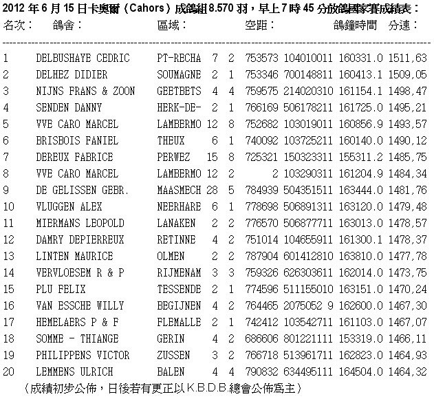 獲得2013年比利時卡奧爾(Cahors)國家賽總數8.562羽的總冠軍鴿舍為狄巴徹-卡迪克(Delbushaye Cedric)鴿舍,該舍冠軍鴿是在比利時時間星期六下午16時03分31秒歸巢,翔距753.573 km,創下平均分速1511.63米/分。