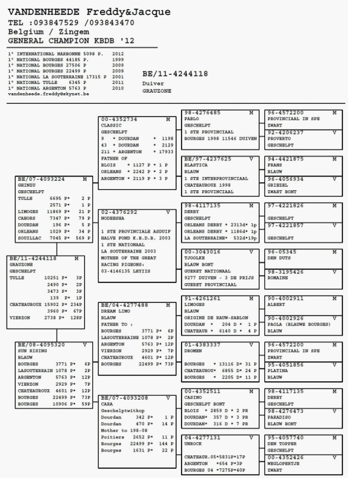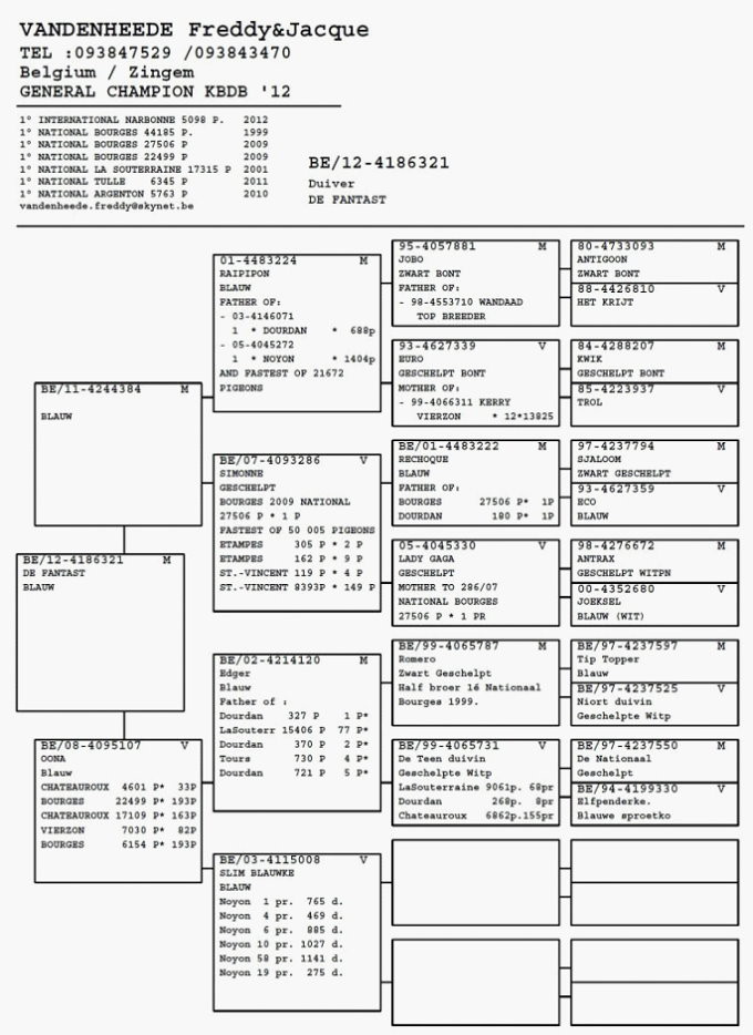 獲得比利時萊邦納(Libourne)國家賽成鴿組6.646羽冠軍(總數12.774羽的總亞軍)為福雷迪.范希(Vandenheede Jacques & Freddy)鴿舍的第二羽歸返鴿,僅以11秒之些微差距屈居亞軍,該鴿是在比利時時間星期六18時20分21秒返舍,翔距723.105公里創下平均分速1047.45 米/分。在成鴿組成績方面福雷迪.范希(Vandenheede Jacques & Freddy)鴿舍除贏得6.646羽冠軍外,尚入賞8位、10位、11位實力超強。