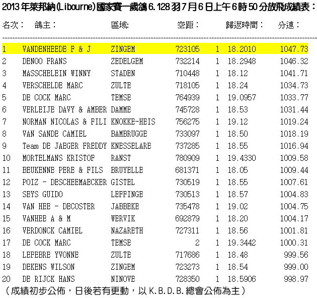 2013年萊邦納全國一歲鴿組6.128羽冠軍