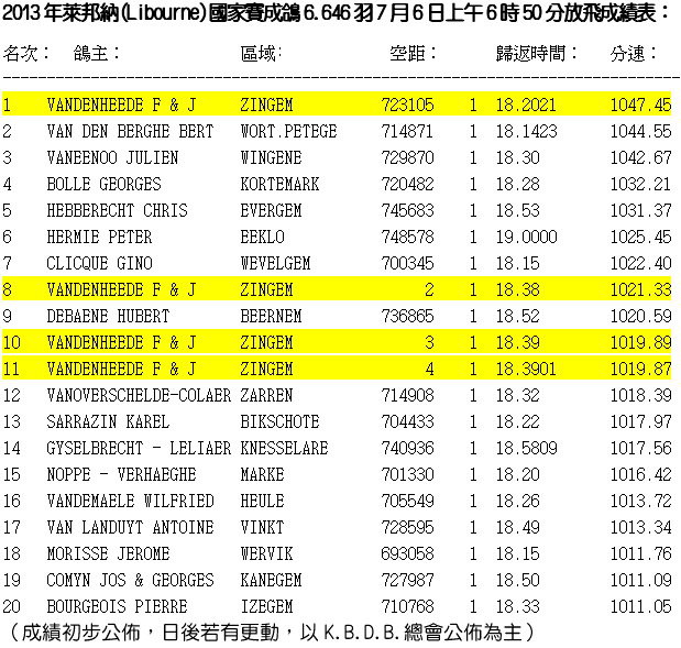 2013年萊邦納全國成鴿組冠6.646羽冠軍。