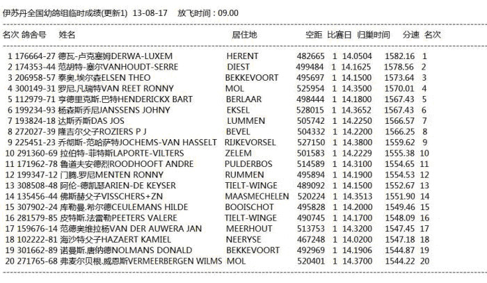 2013年伊蘇丹全國賽成鴿組5.708羽(包括成鴿和一歲鴿)臨時成績(前20位):