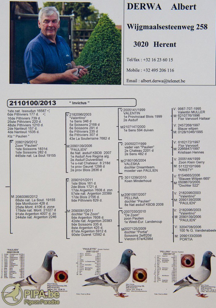 獲得比利時伊蘇丹"幼鴿組"全國冠軍為比利時中距離強豪德瓦.阿爾伯特(Derwa-Albert)鴿舍,該舍冠軍鴿B13-2110100灰公,是在比利時時間星期六下午14時05分04秒返舍,翔距482.665公里,創下平均分速1582.16公尺/分,此鴿同時獲得總數22.295羽(幼鴿組+成鴿+一歲鴿組)總冠軍。