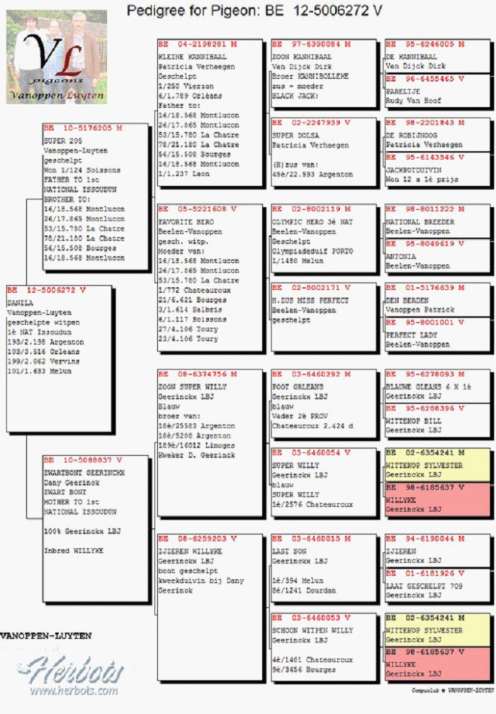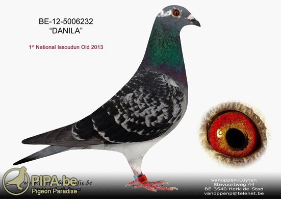 獲得比利時伊蘇丹全國成鴿組5.708羽冠軍(成鴿組+一歲鴿組)為范諾本-路耶騰(Vanoppen-Luyten)鴿舍,該舍冠軍鴿B12-5006272班白羽 母,是在比利時時間星期六下午14時19分44秒返舍,翔距499.647公里,創下平均分速1562.7米/分。