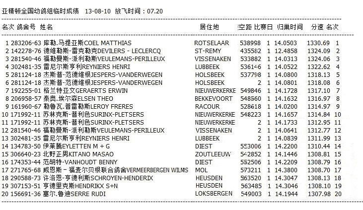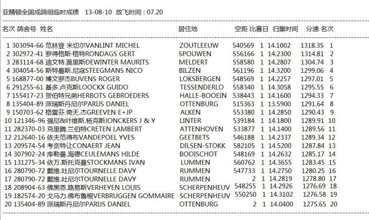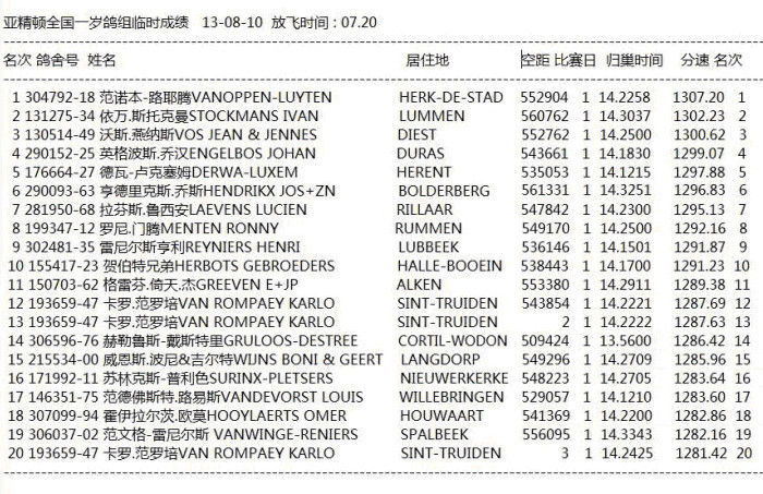 2013年比利時亞精頓II國家賽成鴿組5.942羽臨時成績表(前20位):